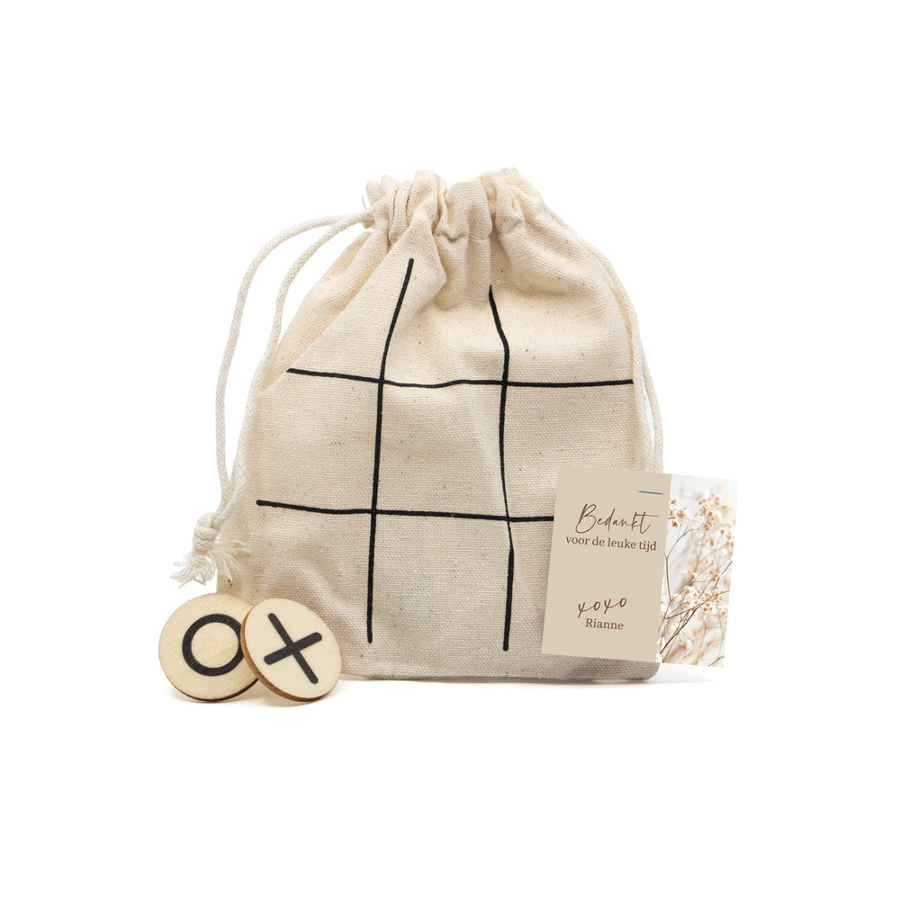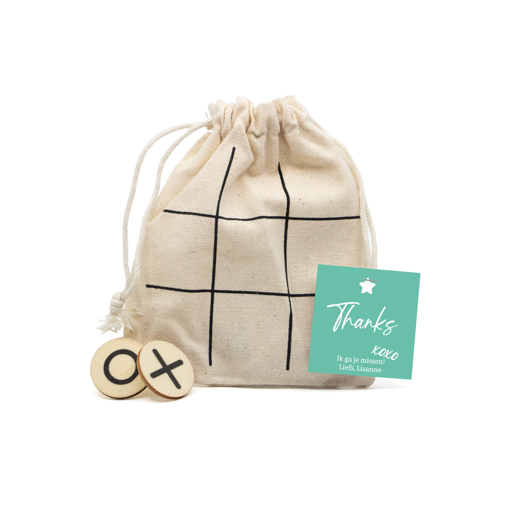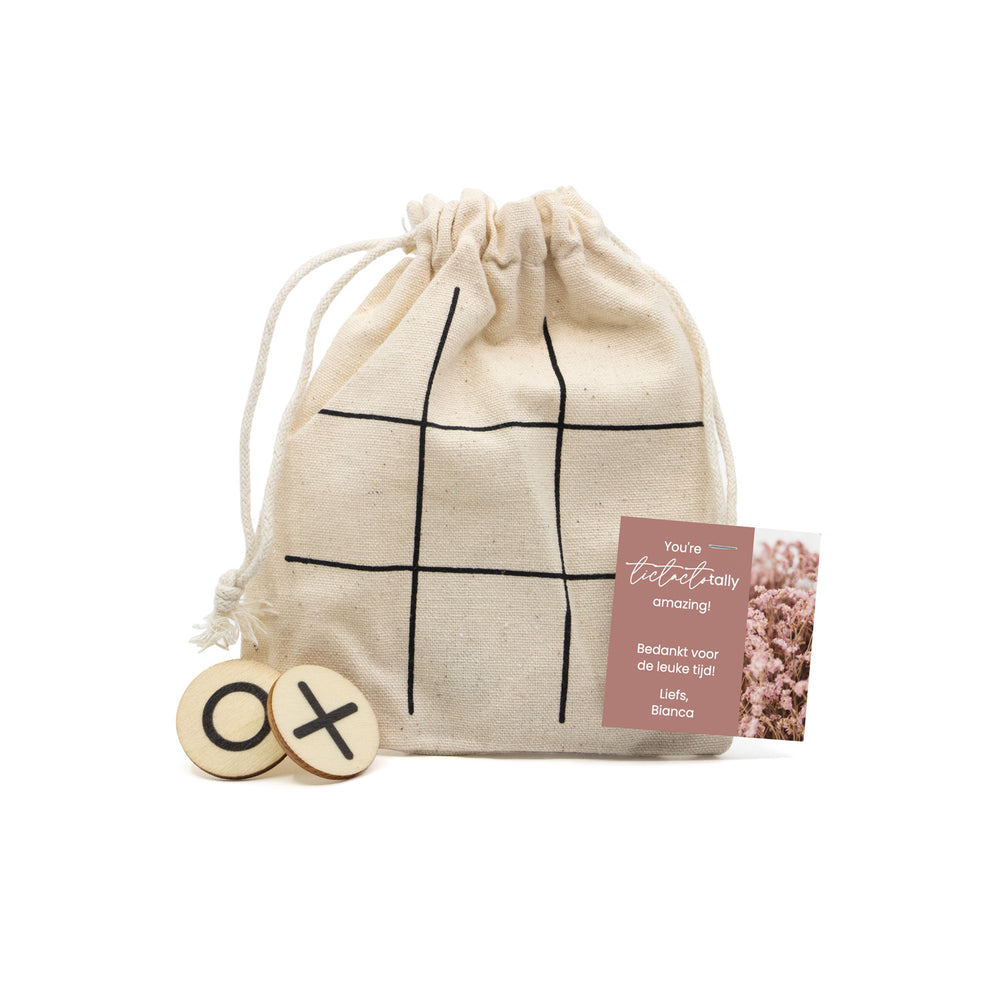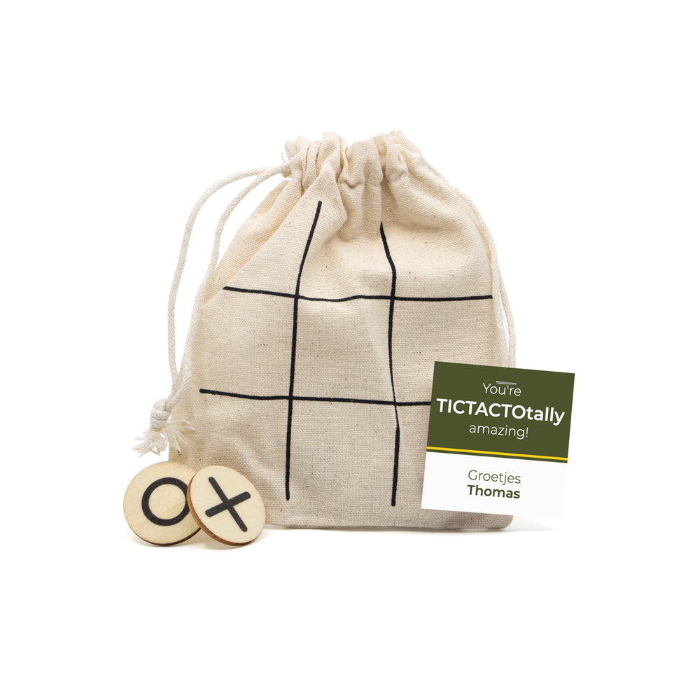 You are tictactotally amazing! Geef je collega's de zak! Katoenen zakje gevuld met 10 fiches. Hier speel je boter-kaas-en-eieren/tic tac toe mee. Gebruik het zakje als speelbord. Het zakje leveren wij met een persoonlijke kaartje eraan. Dit kaartje maak je gemakkelijk zelf via onze online ontwerptool! Een origineel en herbruikbaar cadeau voor je collega's.