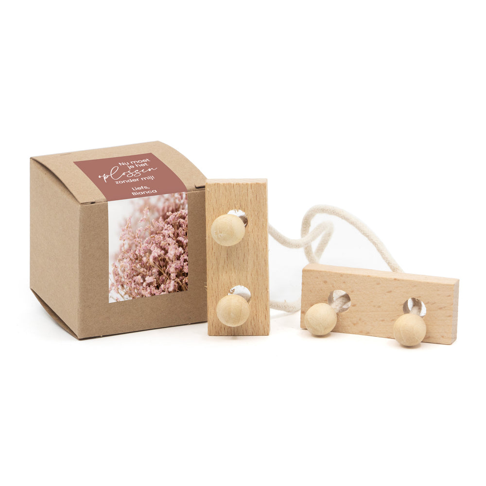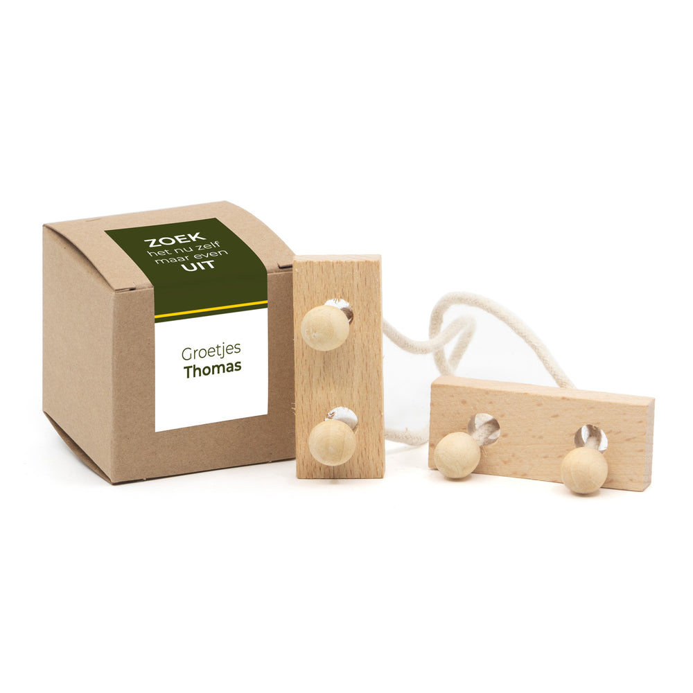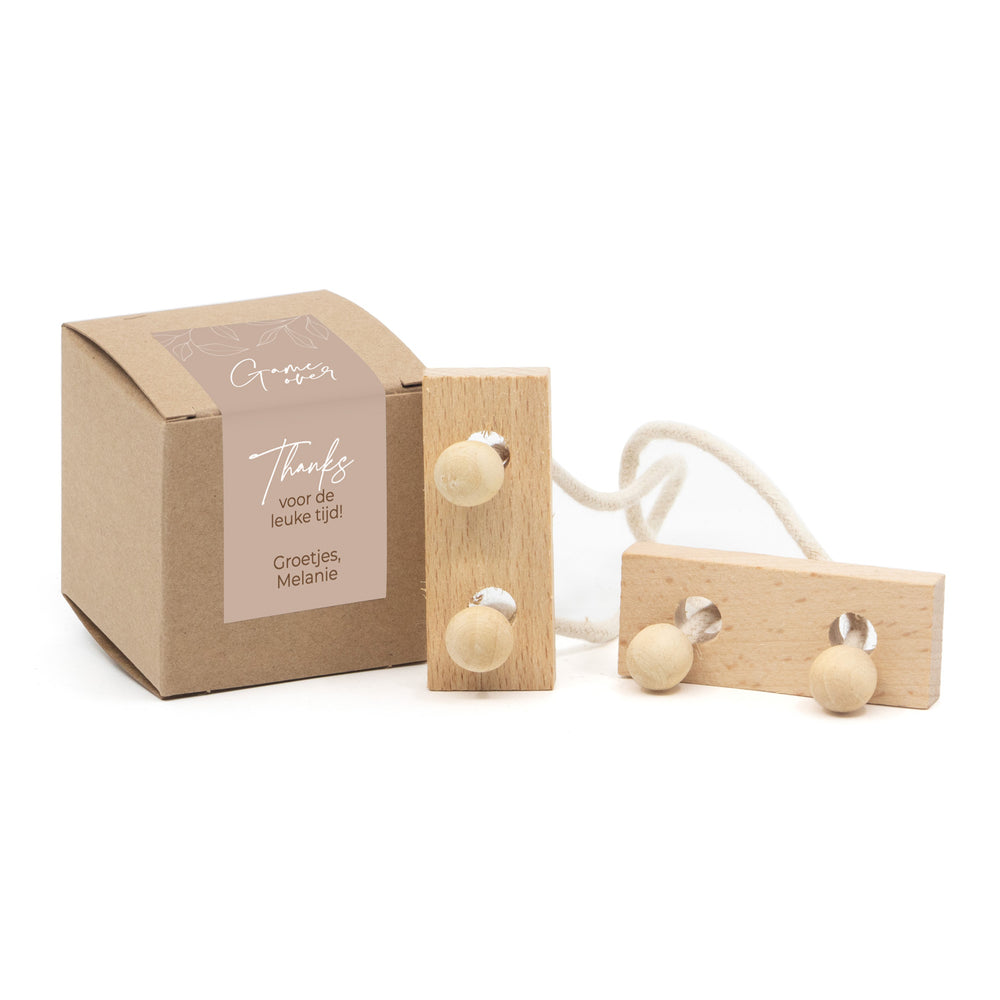 Game over! Een leuke houten breinbreker in een kraft kubus doosje. Wij leveren dit doosje met een persoonlijk etiket die je zelf gemakkelijk kunt opmaken via onze online ontwerptool! Een persoonlijk en bruikbaar afscheidscadeautje voor je collega's.