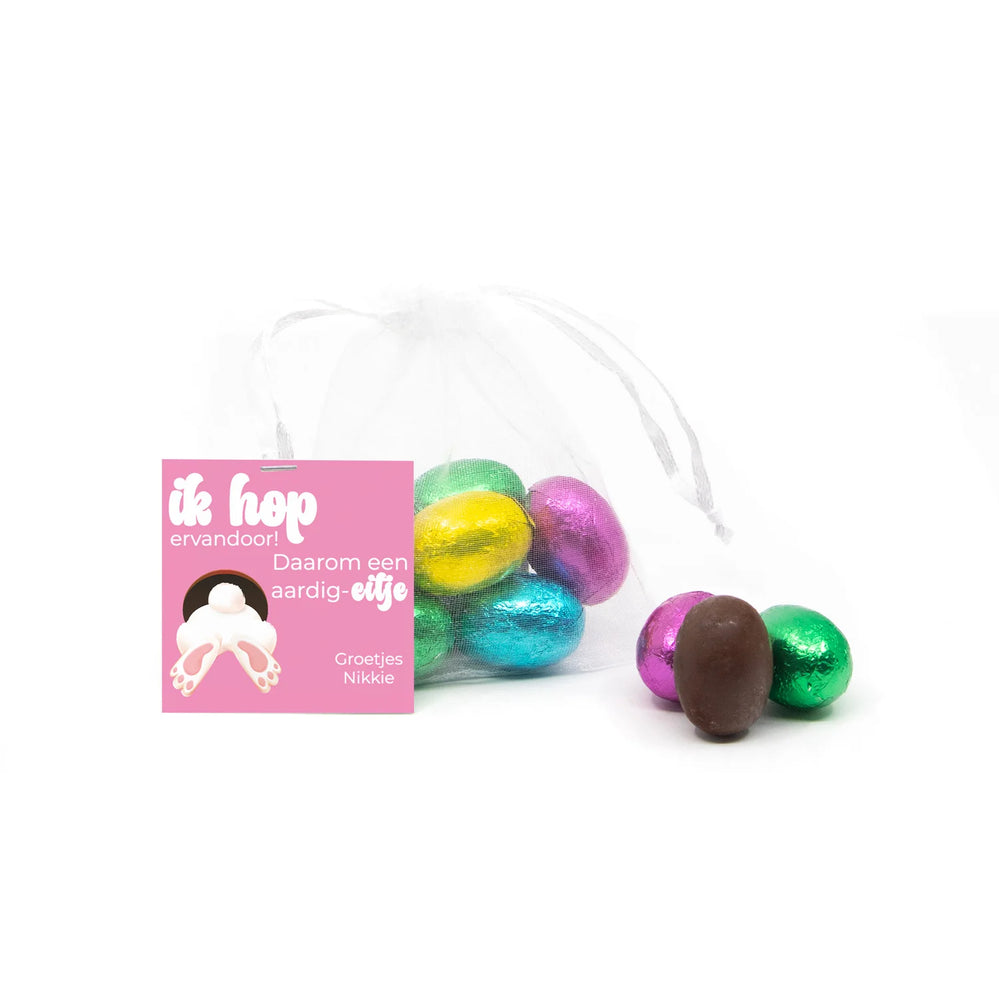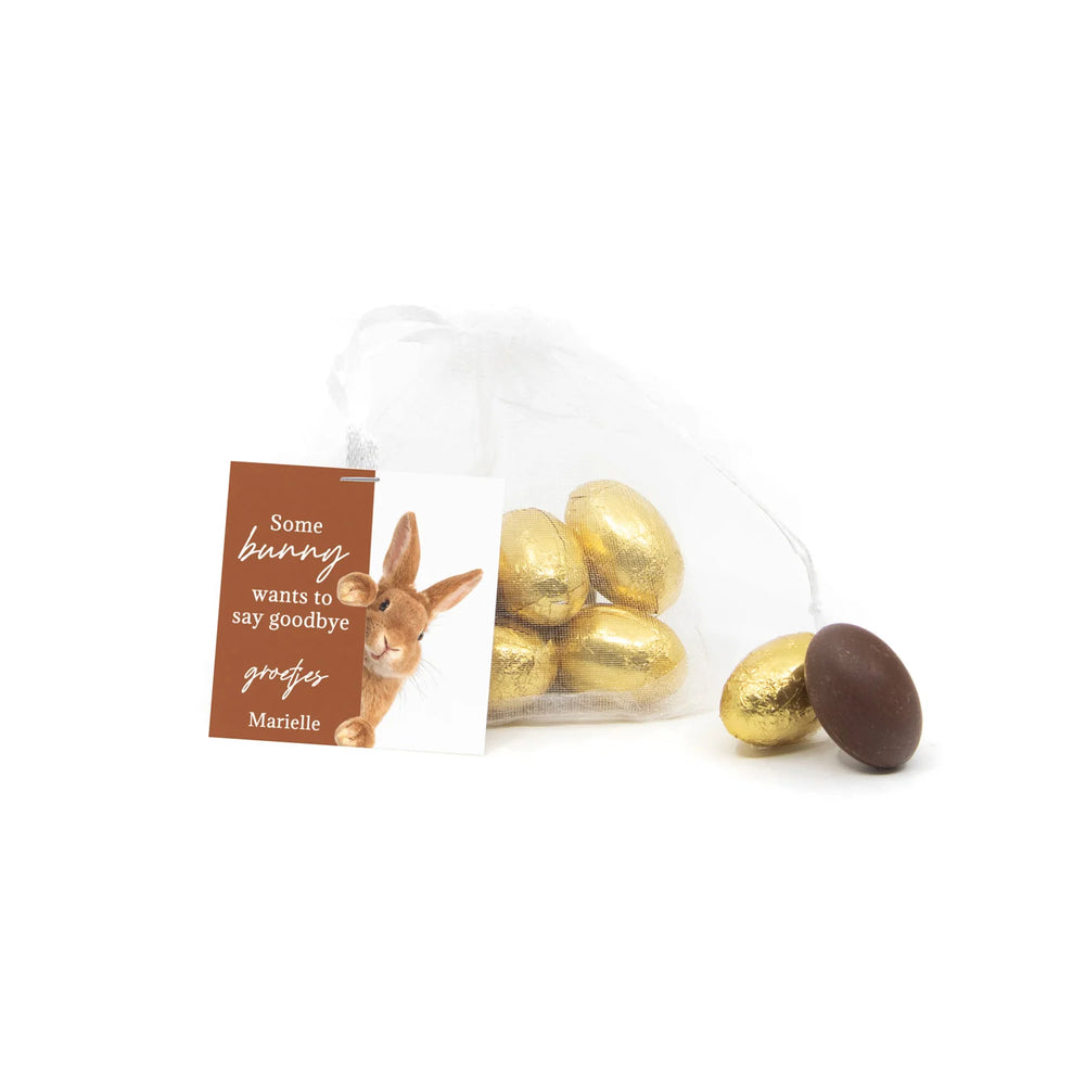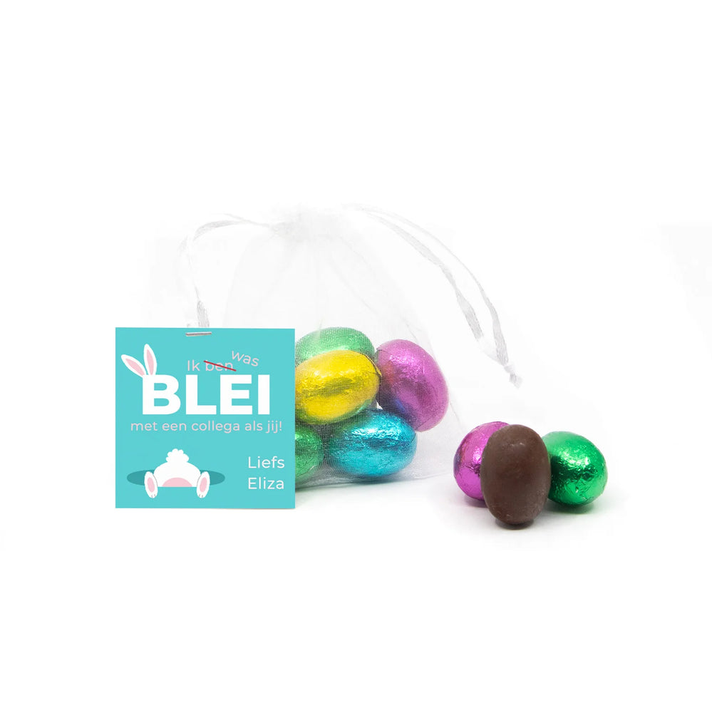 Jij was een EGGCELLENT collega! Bedank je ex-collega's voor de fijne samenwerking met dit organza zakje gevuld met heerlijke melkchocolade eitjes en een personaliseerbaar kaartje. Laat via een persoonlijke boodschap weten dat je altijd erg BLEI bent geweest met zulke lieve collega's.