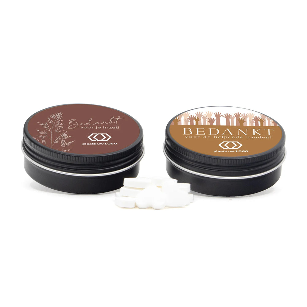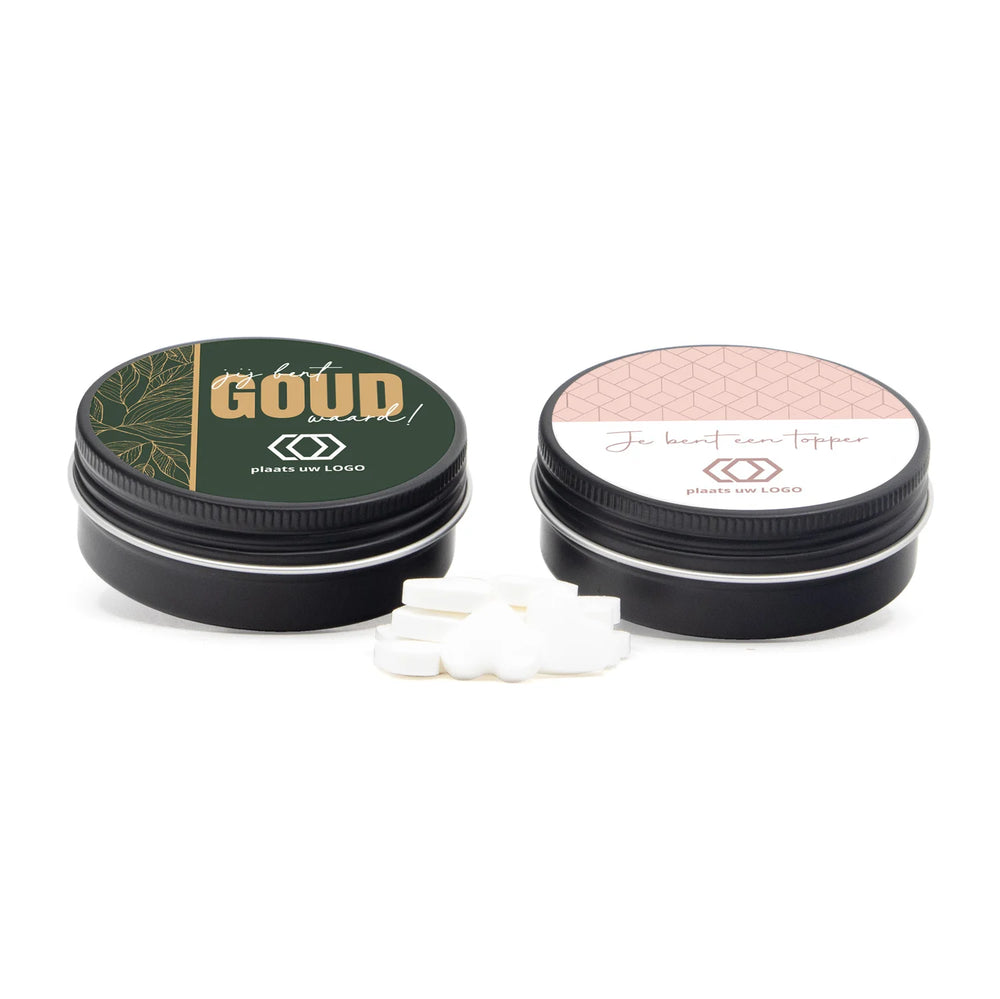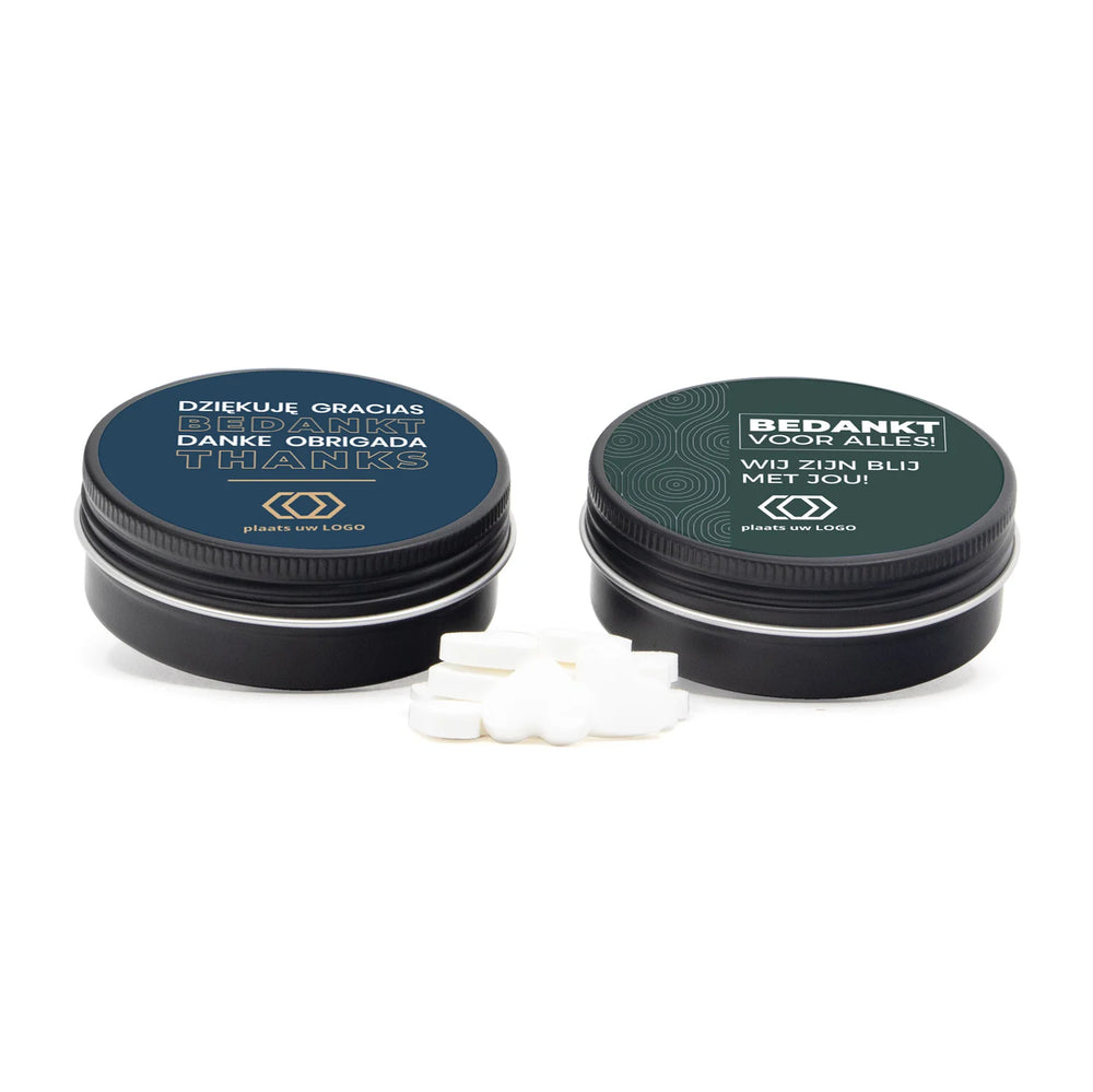 Zwart aluminium blikje met vulling naar keuze. Uiteraard maak je dit blikje helemaal persoonlijk met jouw eigen tekst en/of logo. Dit doe je gemakkelijk via onze online ontwerptool. Een chique weggevertje voor klanten of collega's.