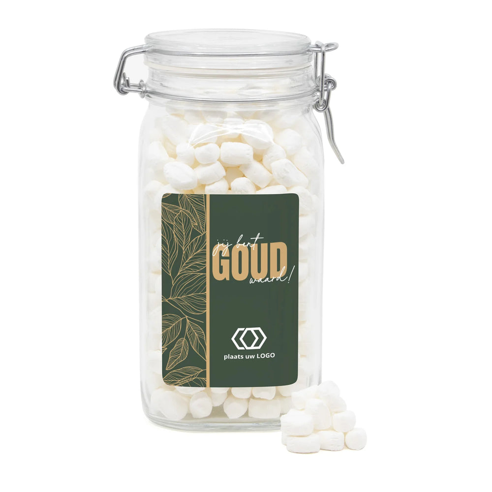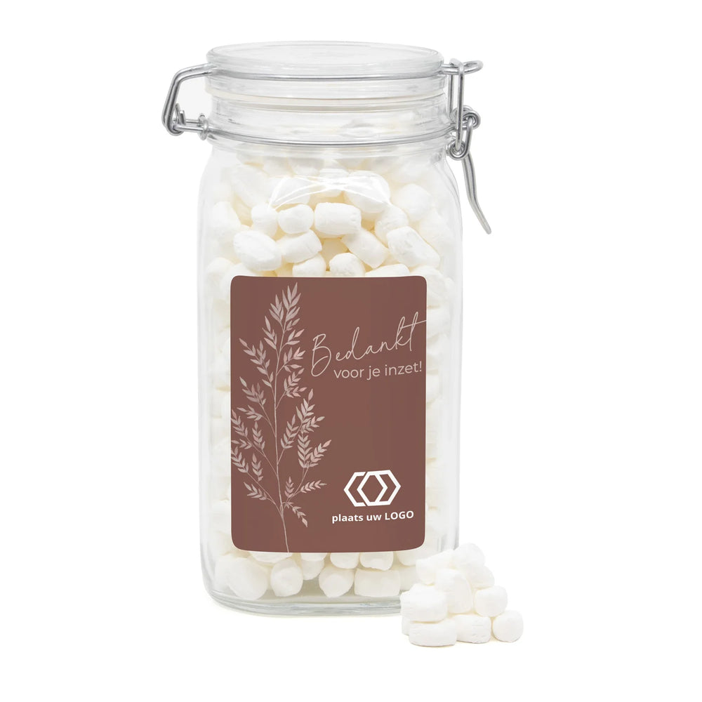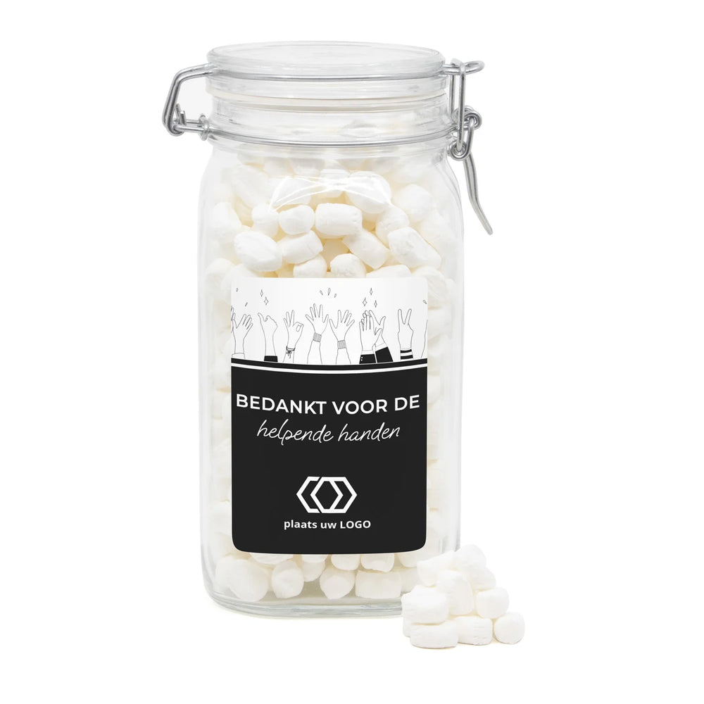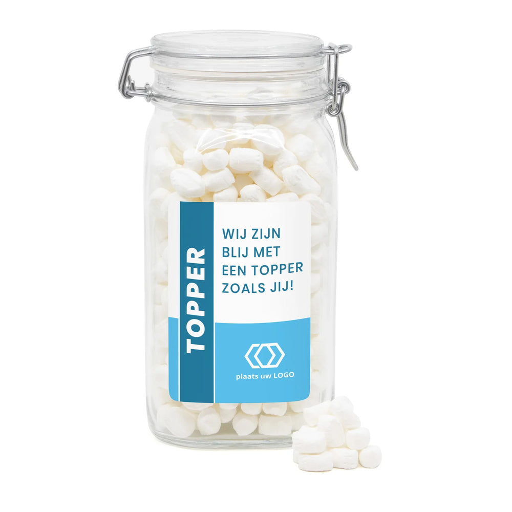 Op zoek naar een origineel en persoonlijk cadeau voor je personeel of klanten? Bestel een mooie glazen weckpot met beugelsluiting en een persoonlijk etiket. Leeg of afgevuld met een vulling naar keuze. De pot zal zeker nog lang gebruikt gaan worden als er een persoonlijke tekst op staat. Een leuk en blijvend bedankje voor je collega's of op de balie bij je klanten! Ontwerp eenvoudig jouw eigen jouw eigen snoeppot via onze online ontwerptool.