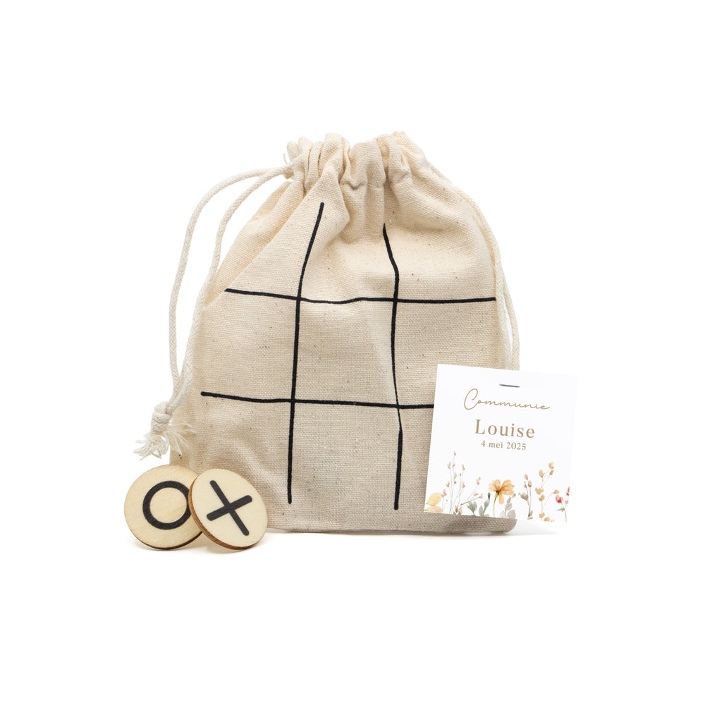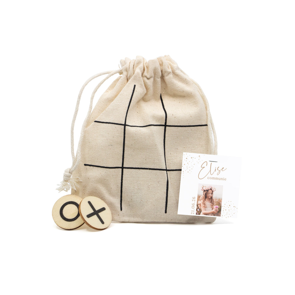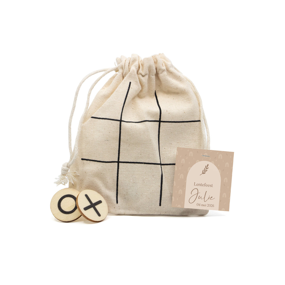 Kom je nog is een spelletje doen? Katoenen zakje gevuld met 10 fiches. Hier speel je boter-kaas-en-eieren/tic tac toe mee. Gebruik het zakje als speelbord. Het zakje leveren wij met een persoonlijke kaartje eraan. Dit kaartje maak je gemakkelijk zelf via onze online ontwerptool! Een origineel en herbruikbaar cadeau na het lentefeest, communie of vormsel.