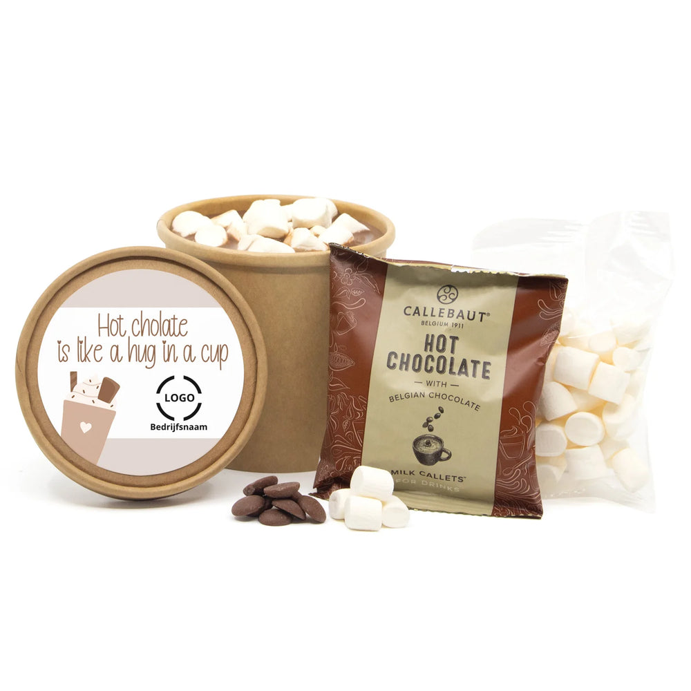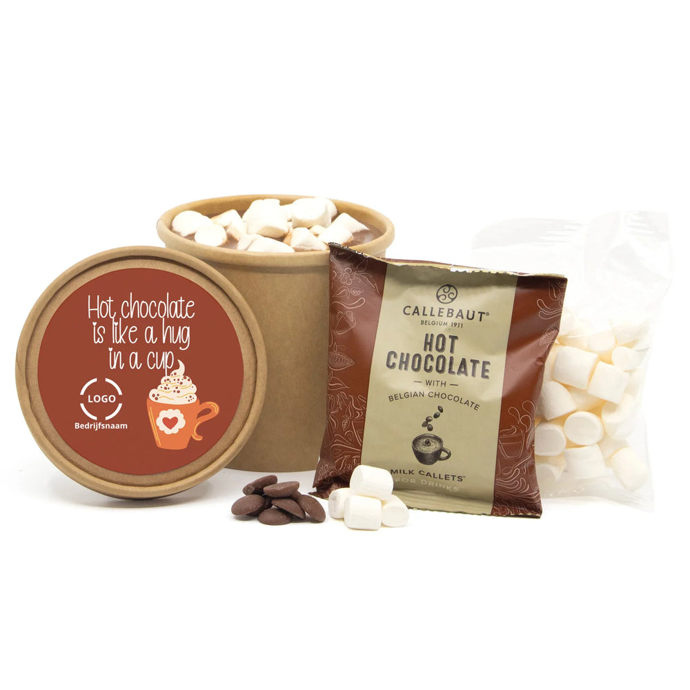 Verwen de vrijwilligers met een heerlijk genietmomentje. In deze sfeervolle kraftbeker vind je een zakje Callebaut-chocoladedruppels die – geroerd door warme melk – zorgen voor een rijk romige kop verse chocolademelk. Met de zachte witte mini-marshmallows wordt het een extra feestelijke traktatie.
