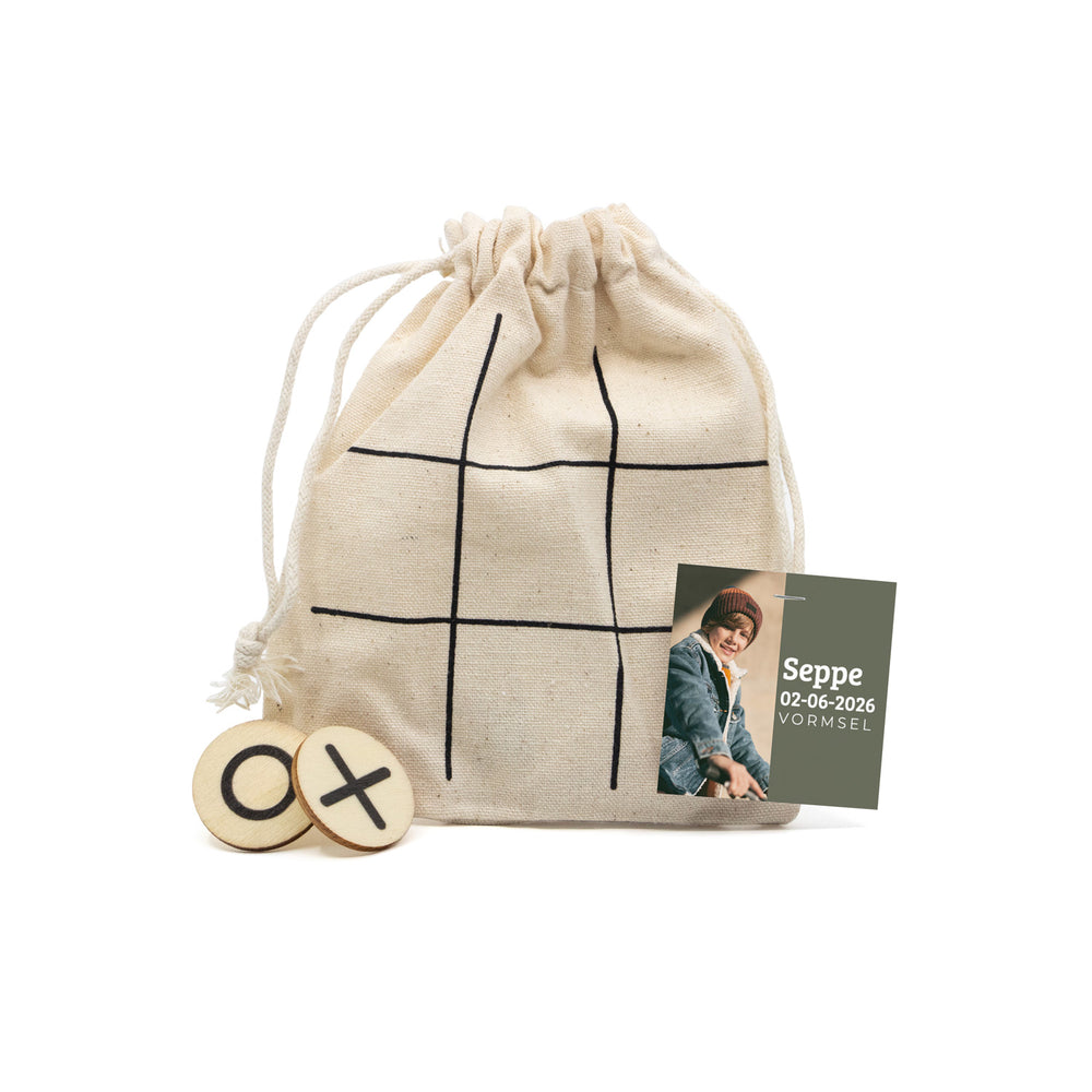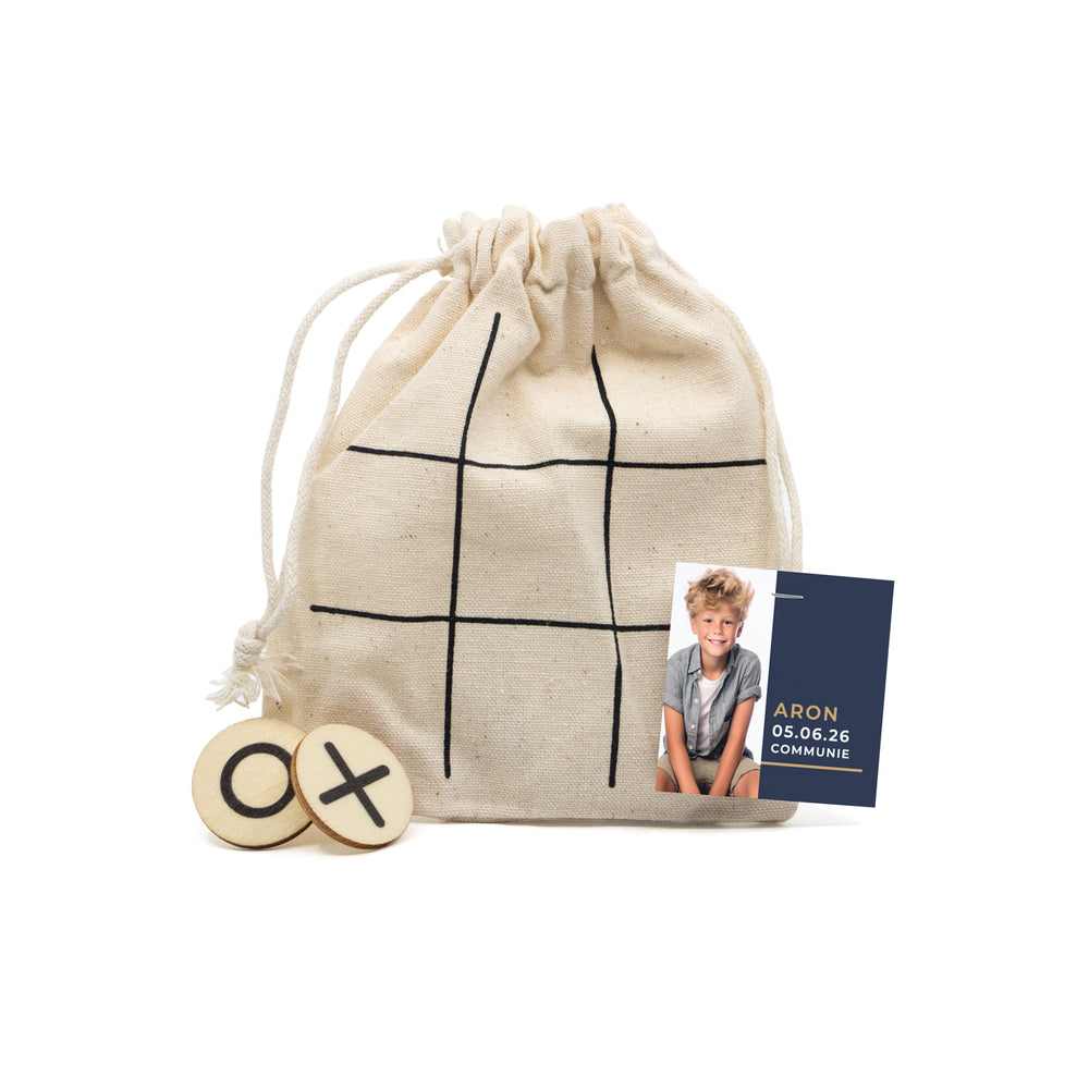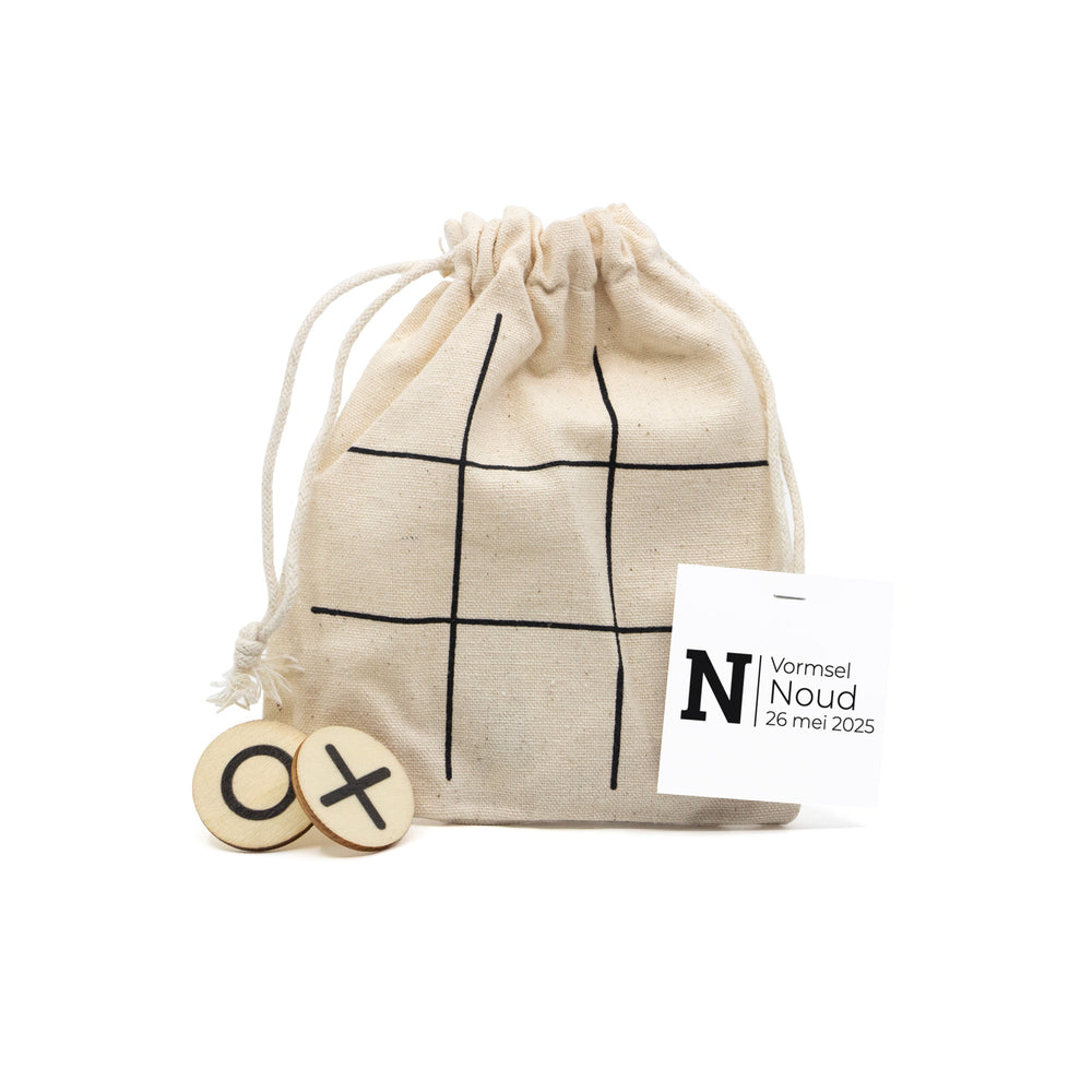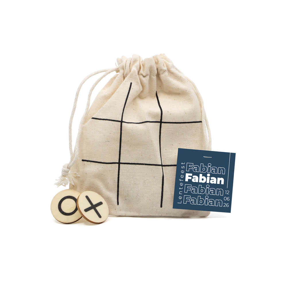 Kom je nog is een spelletje doen? Katoenen zakje gevuld met 10 fiches. Hier speel je boter-kaas-en-eieren/tic tac toe mee. Gebruik het zakje als speelbord. Het zakje leveren wij met een persoonlijke kaartje eraan. Dit kaartje maak je gemakkelijk zelf via onze online ontwerptool! Een origineel en herbruikbaar cadeau na het lentefeest, communie of vormsel.