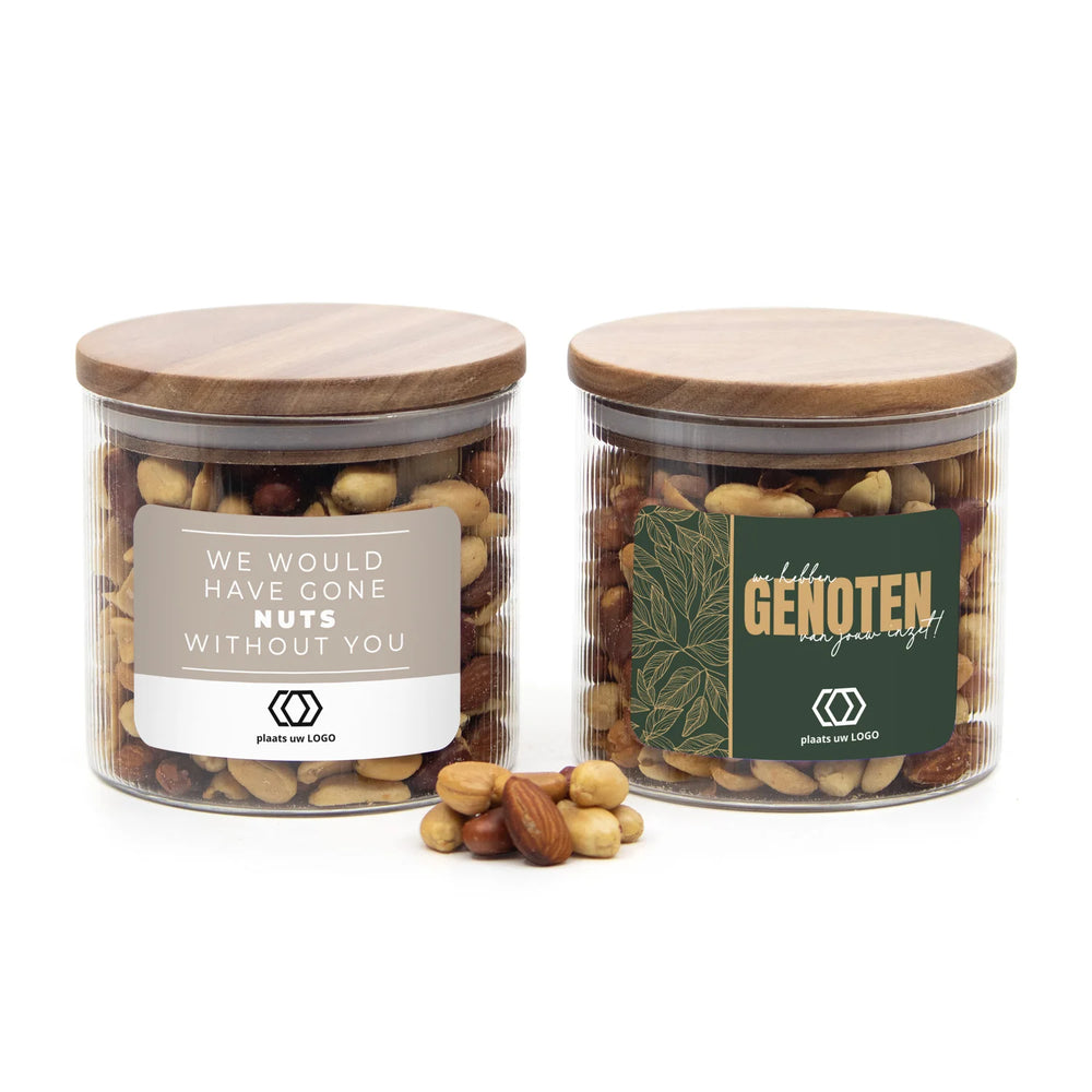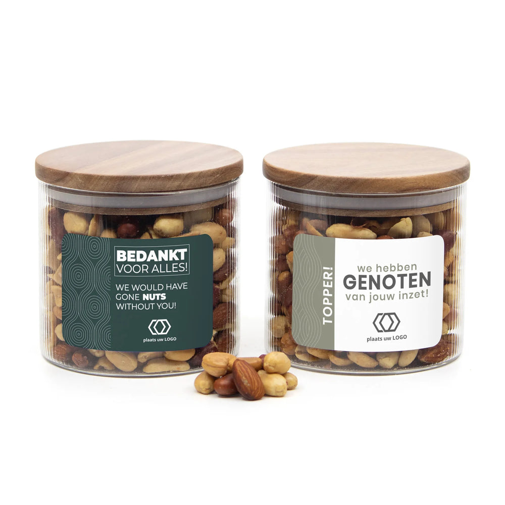 Deze royale glazen voorraadpot van elegant ribbelglas met een prachtig acacia houten deksel is gevuld met 350 gram verse notenmix. Na het genieten van de inhoud is de pot nog herbruikbaar, bijvoorbeeld als bewaarpot.