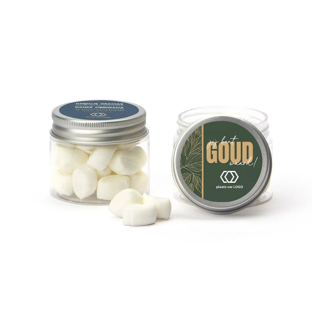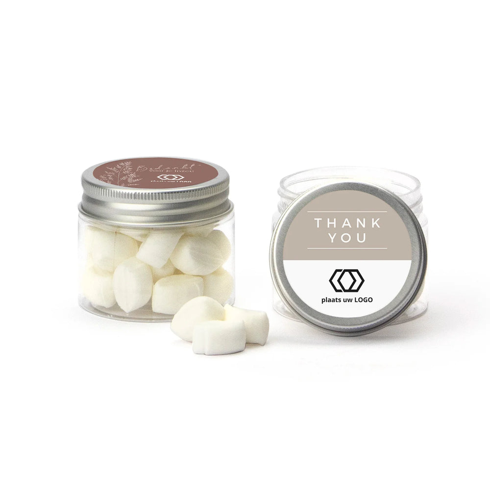 Een kunststof potje met aluminium deksel met snoepjes naar keuze. Bij de potjes hebben we een passend persoonlijk etiket die je zelf kunt ontwerpen. Een leuk klein bedankje om weg te geven.