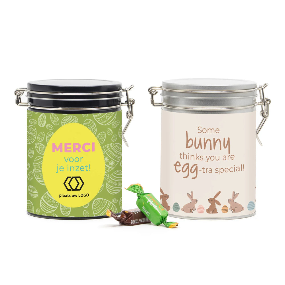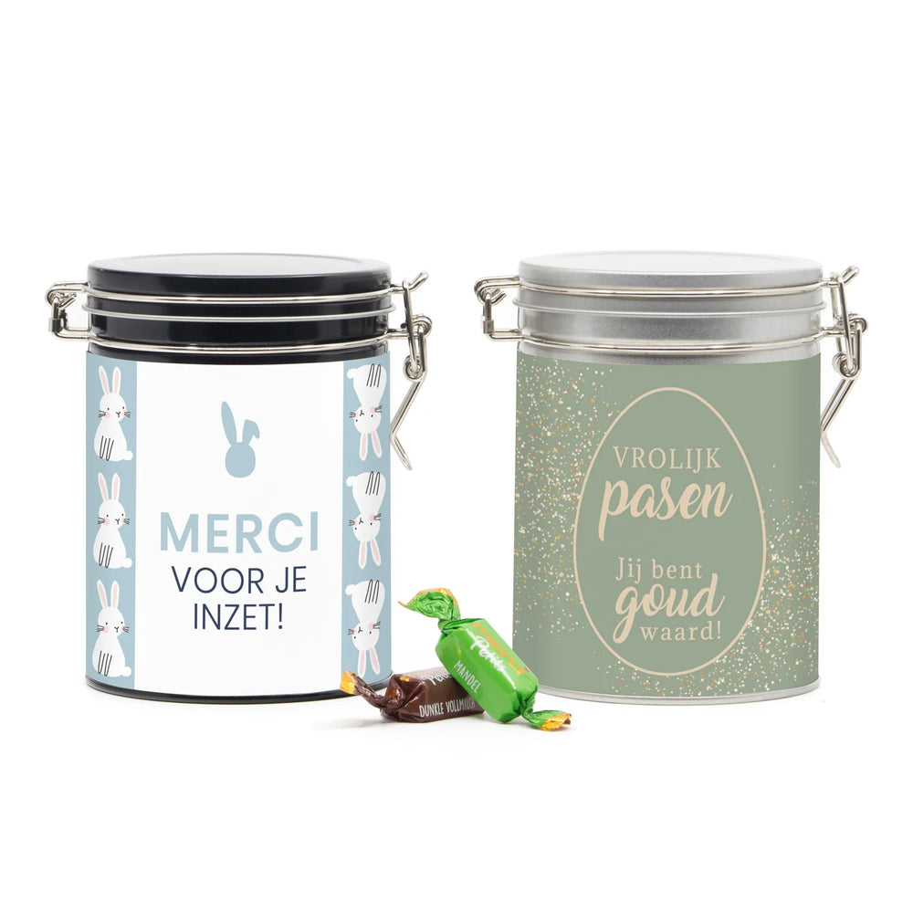 Merci voor je inzet! Een mooi snoepblik met beugelsluiting, voorzien van een wikkel met eigen ontwerp en afgevuld met Merci petits chocolaatjes. Een blik om uit te delen met pasen aan klanten of collega's. Het wikkel kun je helemaal personaliseren met een eigen ontwerp. Luchtdichte sluiting door middel van een beugel.