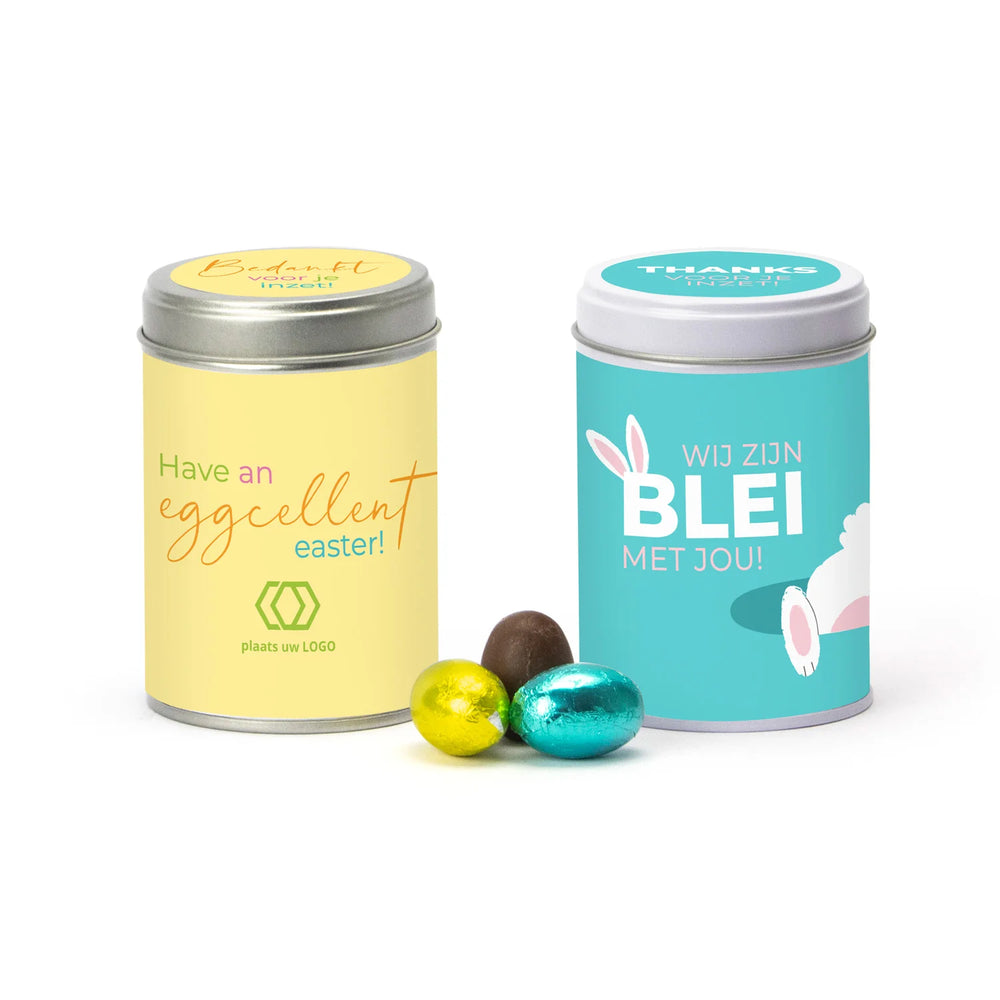 Een mooi bewaarblikje met 150 gram melkchocolade paaseitjes, voorzien van een eigen paaswikkel. Het is ook mogelijk om een bijpassende dekselsticker te bestellen. Dit blik met logo zal vast nog lang bewaard worden, dus de boodschap op het wikkel zal nog lang onder de aandacht blijven. Een leuk cadeau om weg te geven als bedankje voor de Pasen!