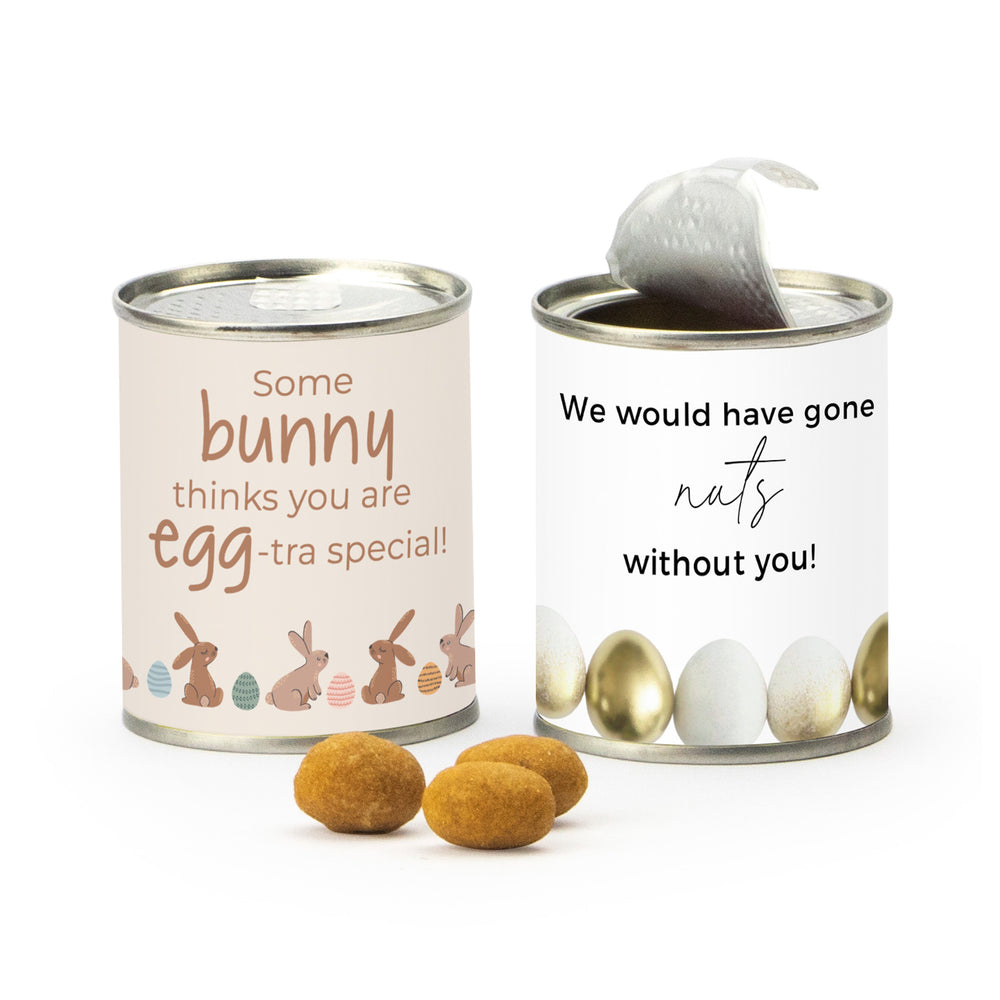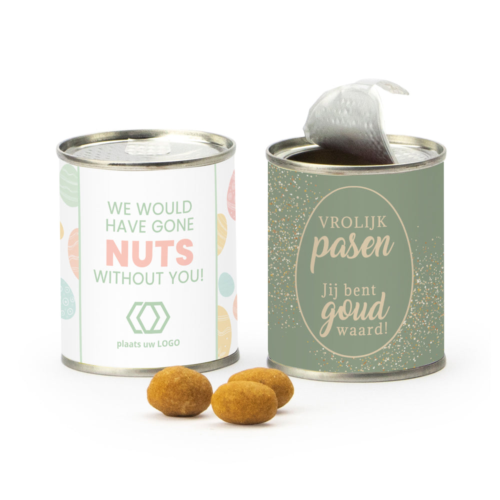 We would have gone NUTS without you! Een blikje met borrelnootjes voorzien van een paaslabel met bedrijfsnaam en/of logo die je zelf online kunt ontwerpen. Go nuts en ontwerp zelf je paaslabel!