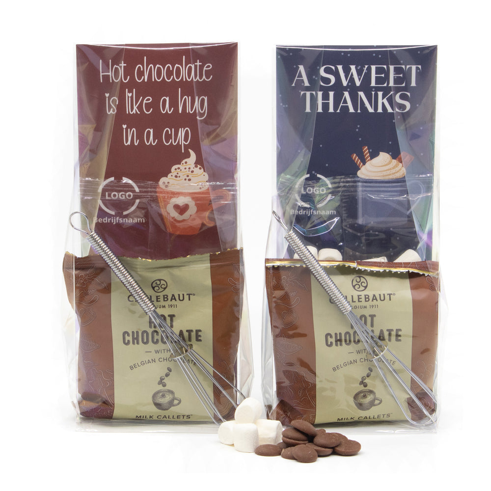 Dit leuke verwenpakketje is voor een heerlijk warm genietmoment voor de vrijwilligers. Het zakje is gevuld met 1 zakje Callebaut chocoladedruppels die je door de warme melk kunt roeren voor een heerlijke kop verse chocolademelk. Samen met een zakje witte mini marshmallows en een kleine garde om het helemaal compleet te maken. Inclusief een persoonlijke etiket die je zelf kunt opmaken.