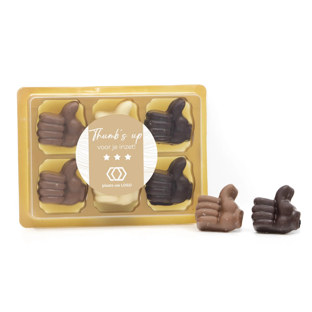 Een leuk doosje met 6 heerlijke massieve chocolade compliment duimpjes en persoonlijk etiket die je zelf online kunt ontwerpen. Heel toepasselijk voor complimentendag
