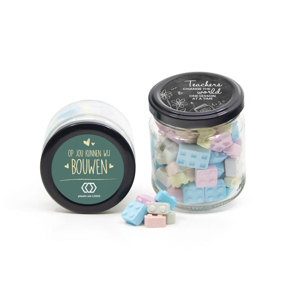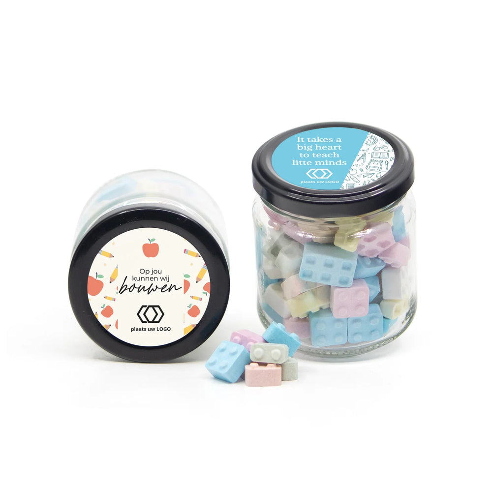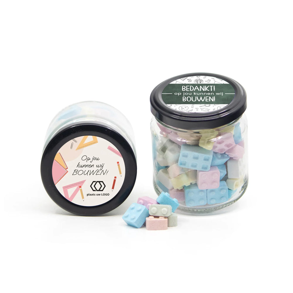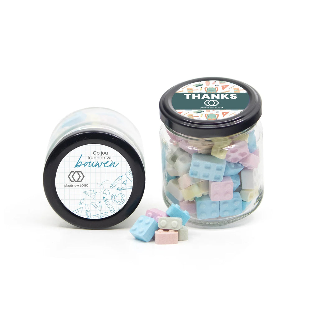 Laat jouw waardering blijken met dit glazen snoeppotje, gevuld met kleurrijke bouwsteen dextrose-snoepjes. Maak het cadeau extra persoonlijk met een eigen etiket. Ontwerp dit eenvoudig zelf via onze online ontwerptool en voeg een persoonlijke boodschap, logo of foto toe.