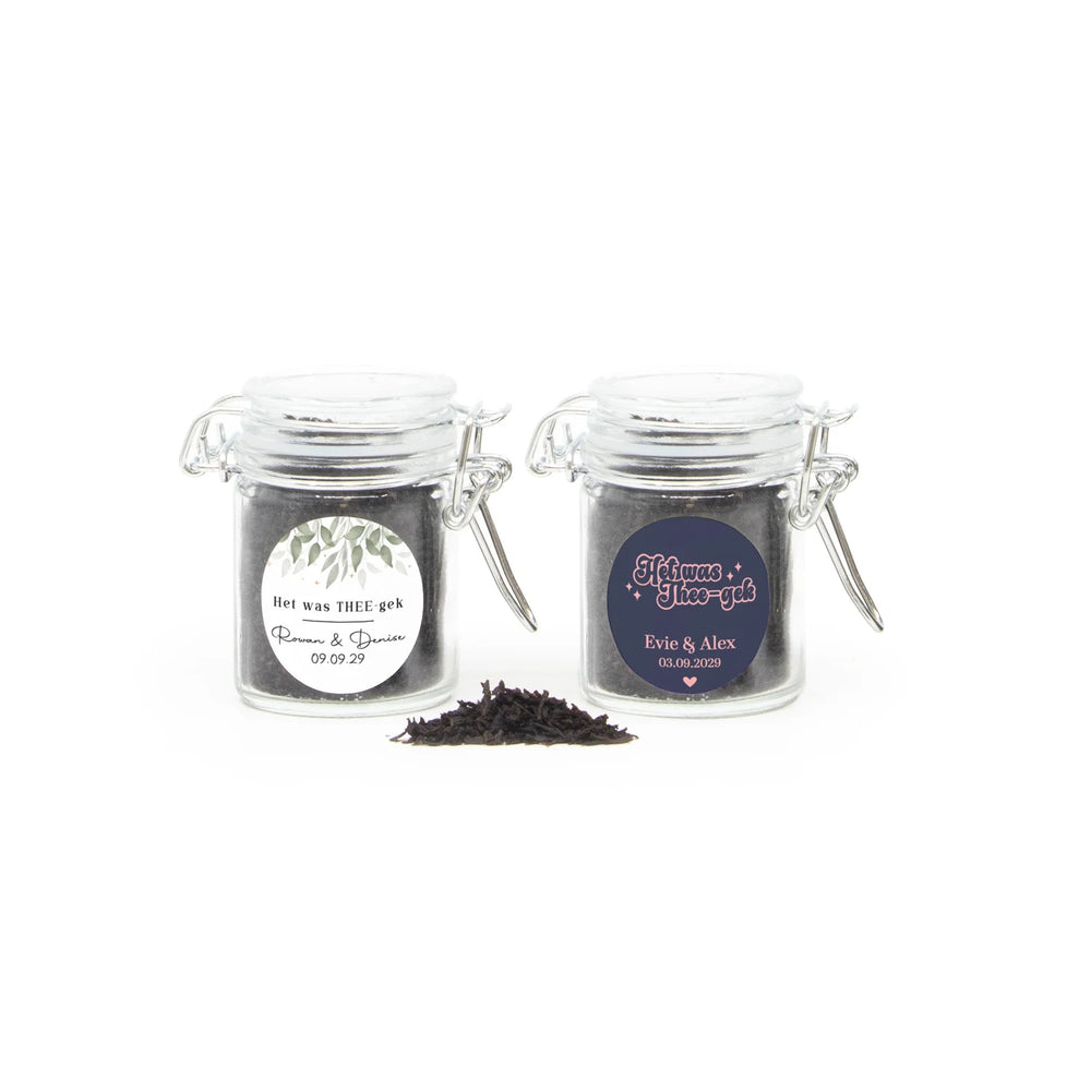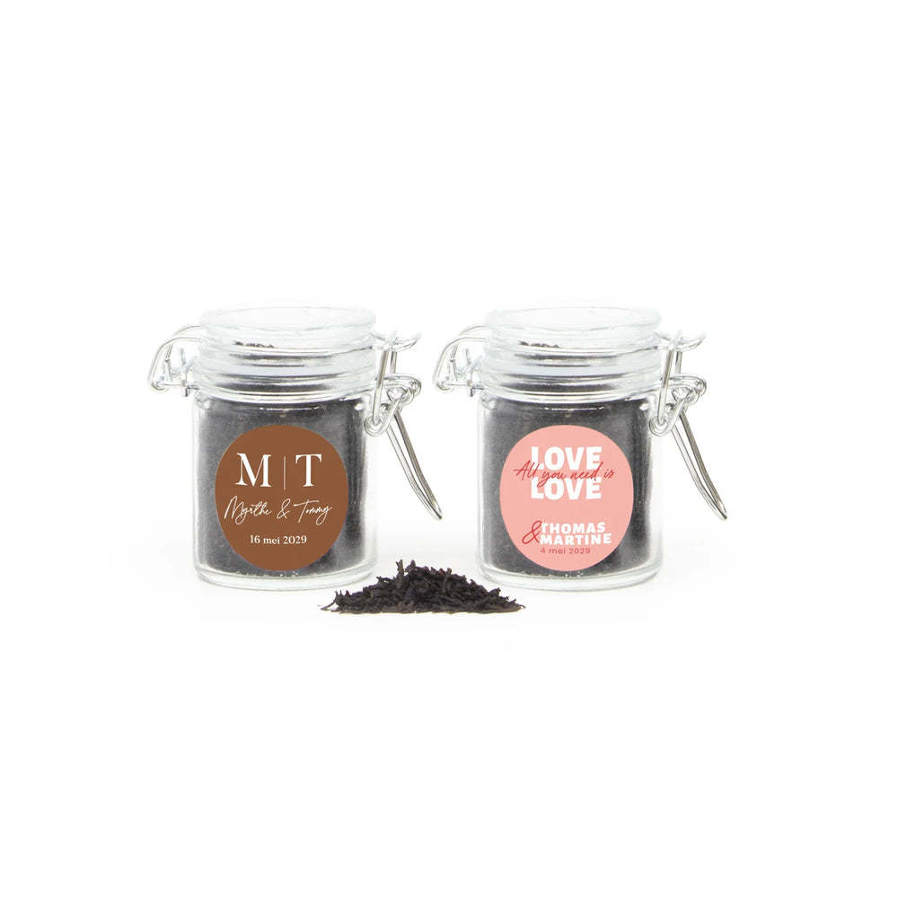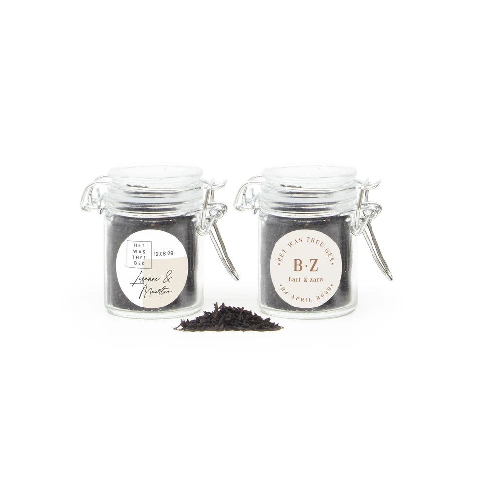 Glazen weckpotje met beugelsluiting, inclusief thee en een persoonlijk etiket. Dit etiket kun je personaliseren met jullie eigen namen en trouwdatum in de online ontwerptool. Je hebt de keuze uit verschillende smaken thee.