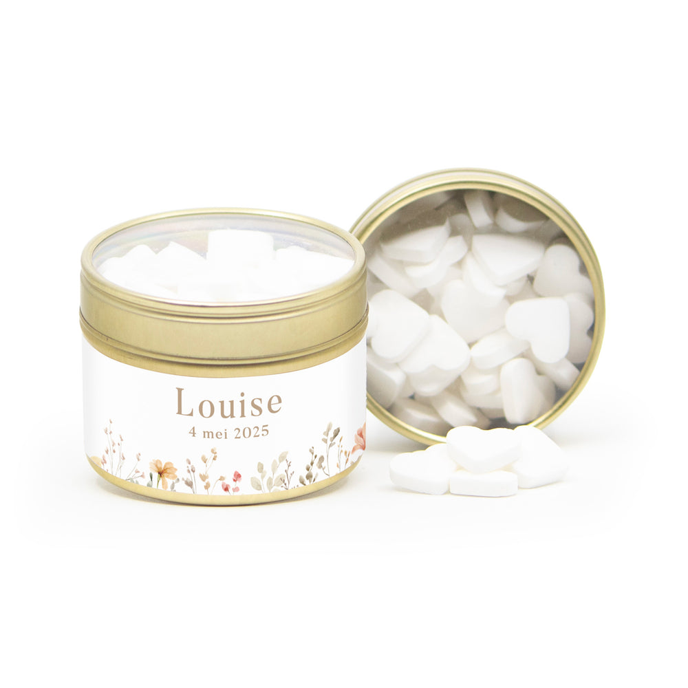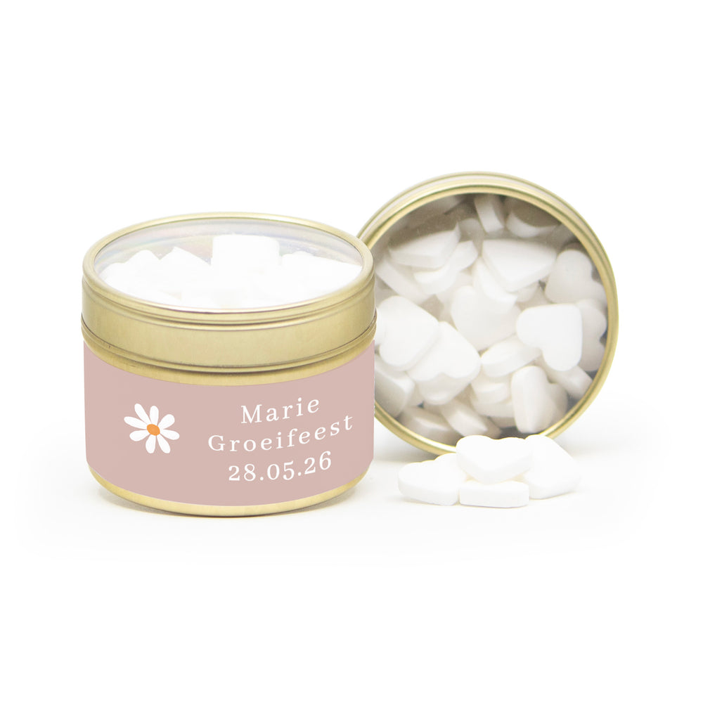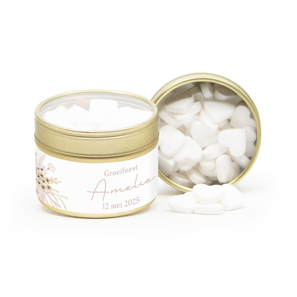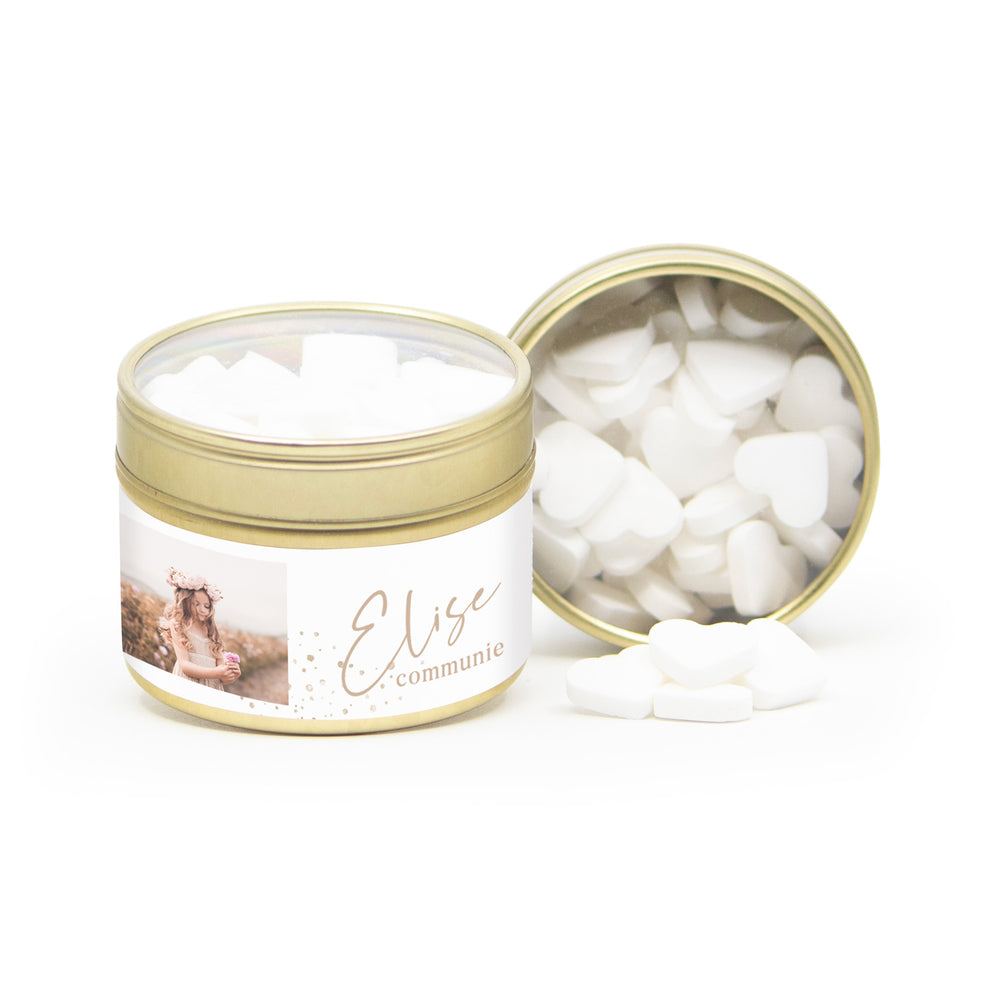 Het blikje heeft een transparant vensterdeksel, waardoor de inhoud direct zichtbaar is. Ontwerp zelf een vrolijk wikkel met de naam van de communicant, de datum of een leuke foto!