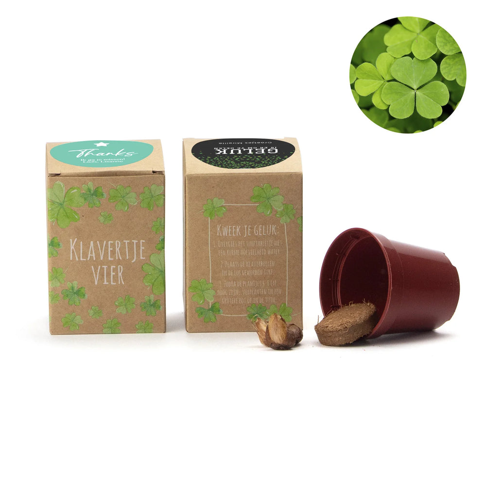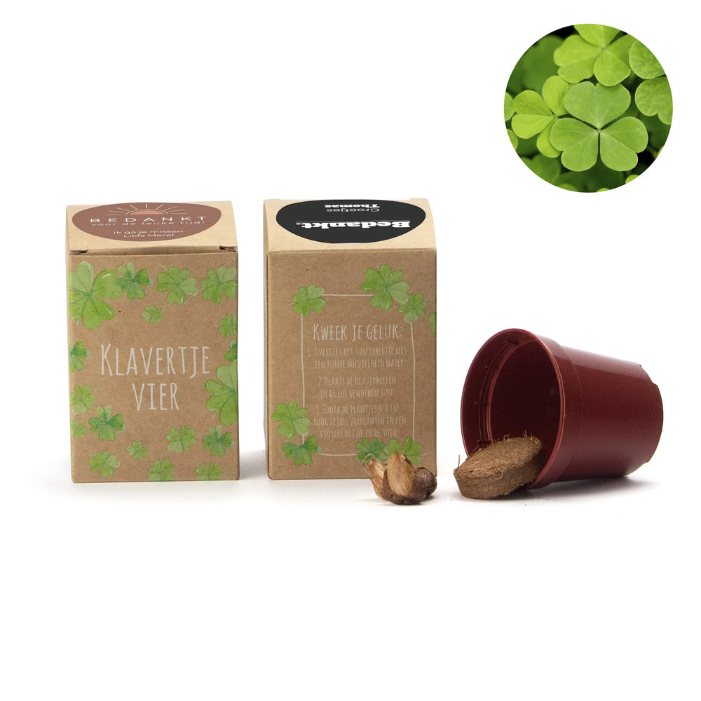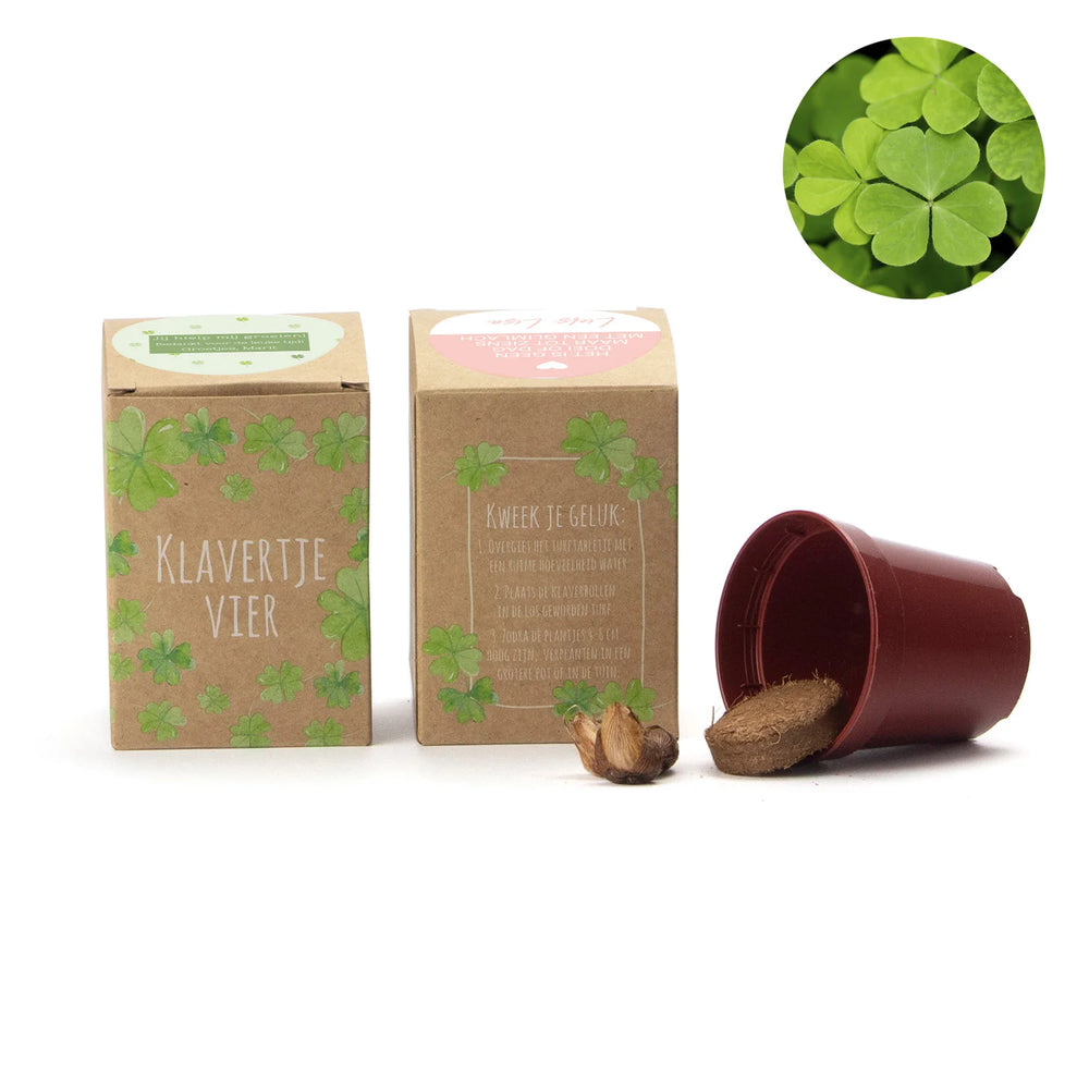 Het is heel eenvoudig om zo klavertjes vier te kweken... de instructies staan achterop het doosje. Enkele dagen na het poten zie je al resultaat. Het is verpakt in een natuurlijk kraftdoosje.
