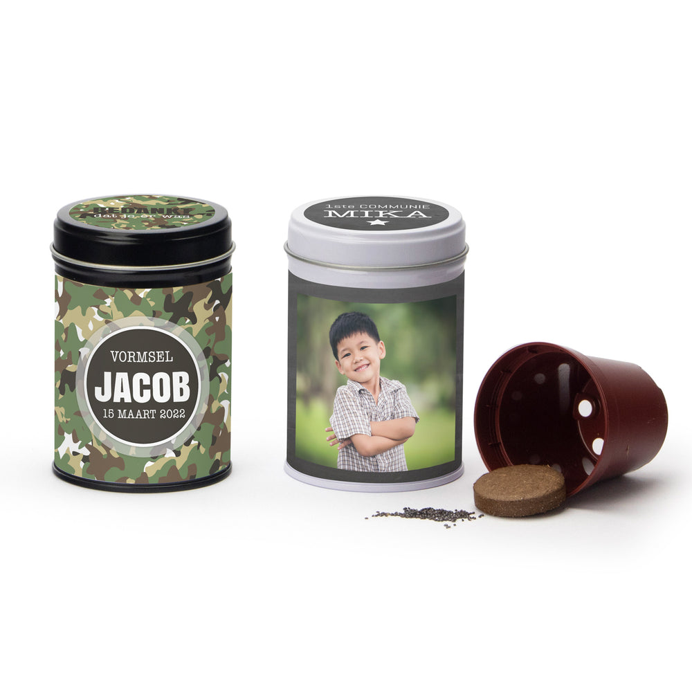 Bedankjes in de categorie groene bedankjes zijn complete kweeksetjes om eigen plantjes mee te kweken. Vergeet mij nietjes, zonnebloemen, klavertjes vier. Allemaal in een blikken doosje met eigen foto en naam.