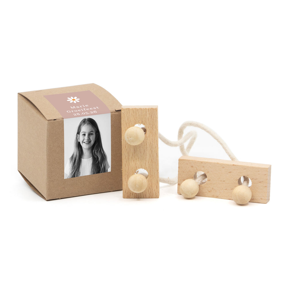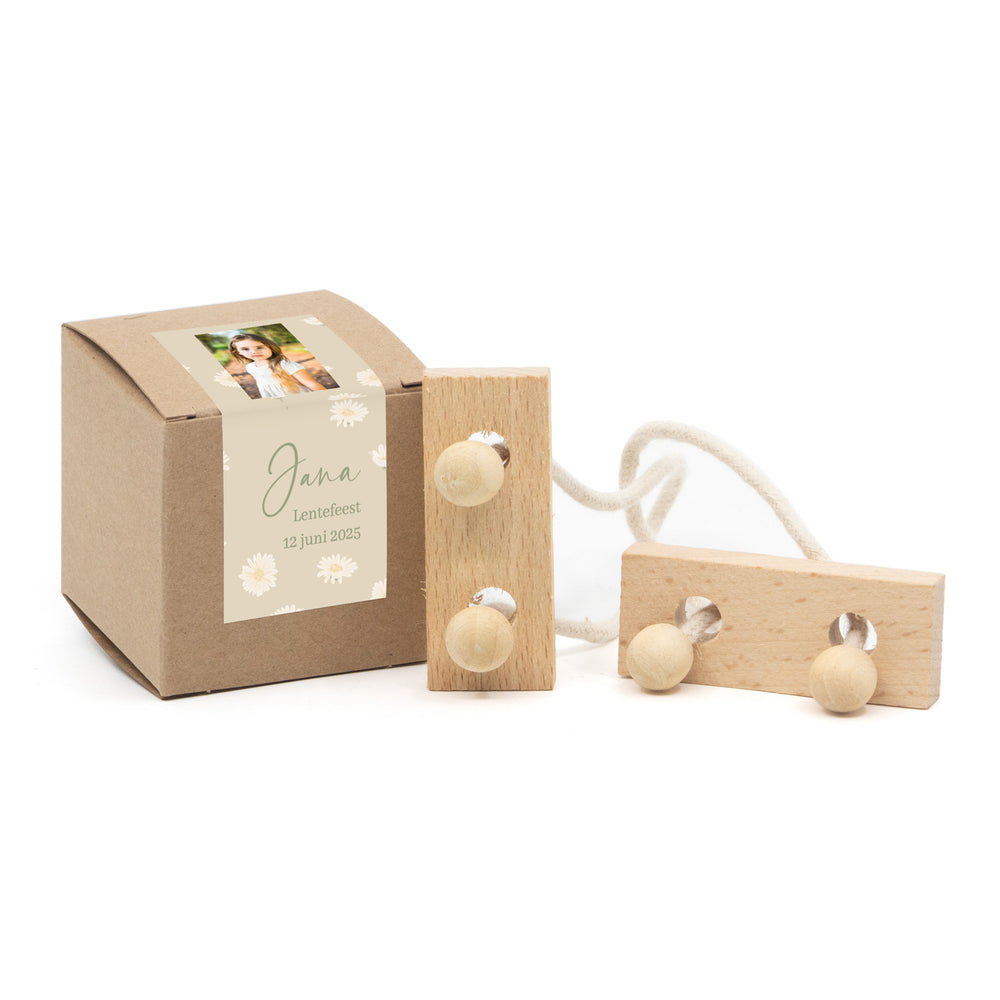 Een leuke houten breinbreker in een kraft kubus doosje als bedankje voor na het vormsel, lentefeest of communie. Wij leveren dit doosje met een persoonlijk etiket die je zelf gemakkelijk kunt opmaken via onze online ontwerptool! Een leuk en origineel cadeau! Wie van de gasten krijgt het voor elkaar?