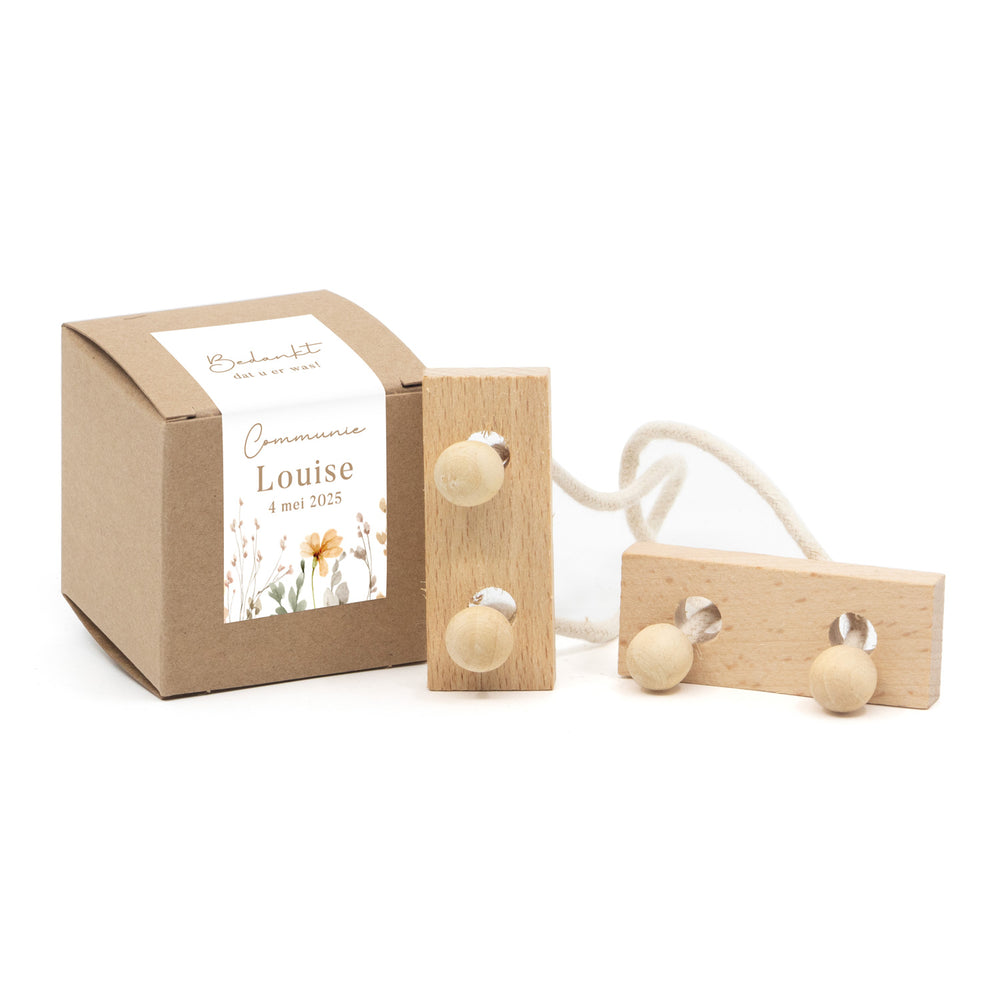 Een leuke houten breinbreker in een kraft kubus doosje als bedankje voor na het vormsel, lentefeest of communie. Wij ... Lees meer