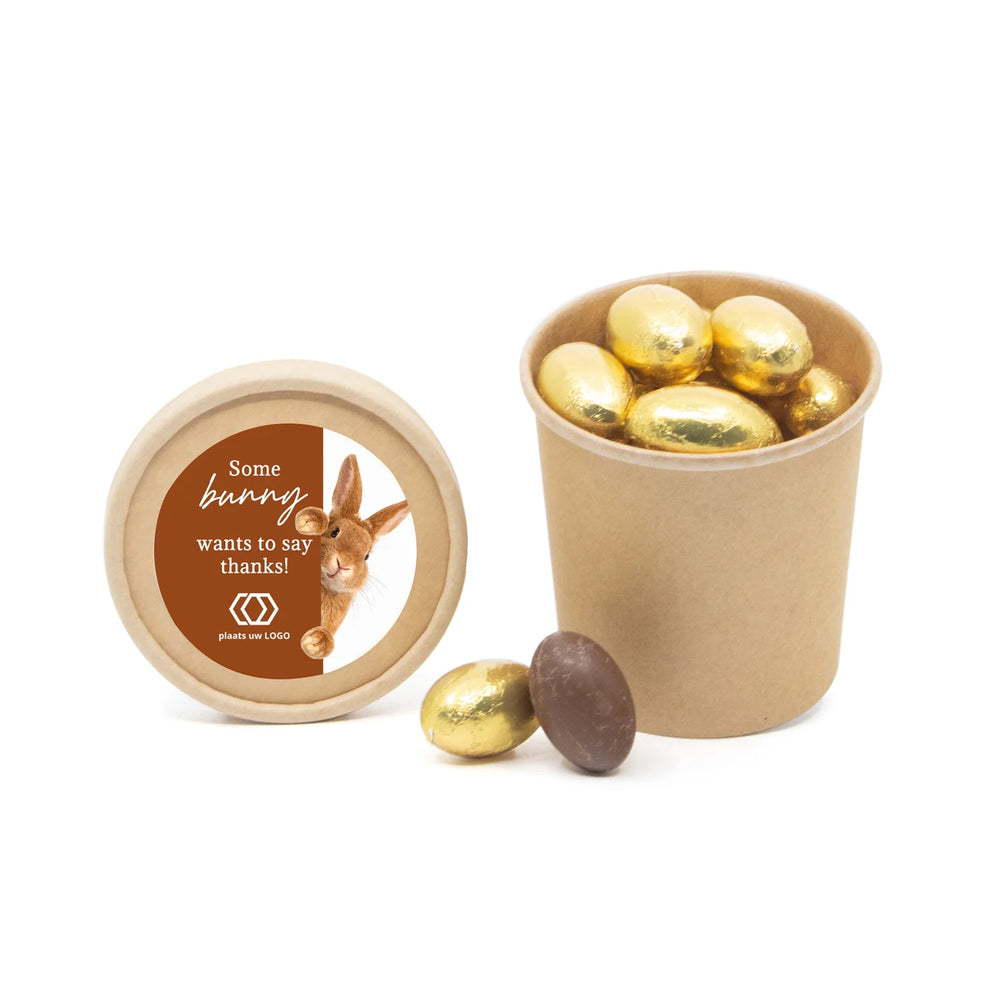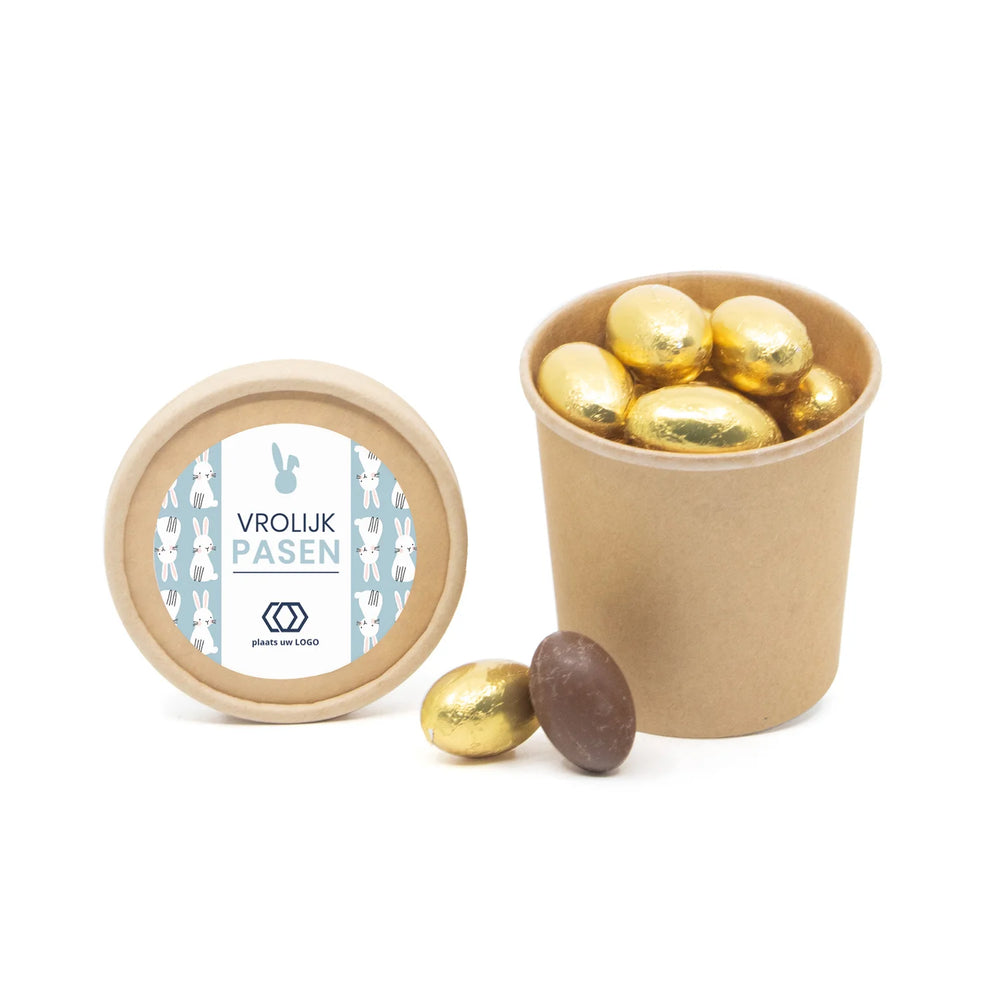Een duurzaam bedankje voor pasen afgevuld met chocolade paaseieren. Deze bio bekers zijn gemaakt van gerecycled materiaal. Het etiket op het deksel is volledig te personaliseren met een eigen tekst.