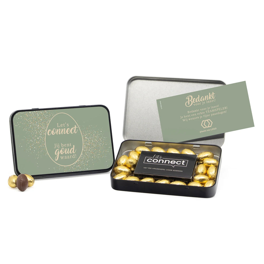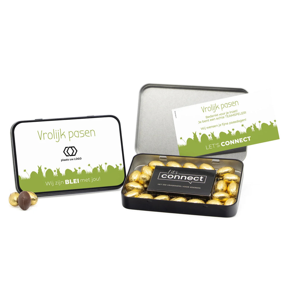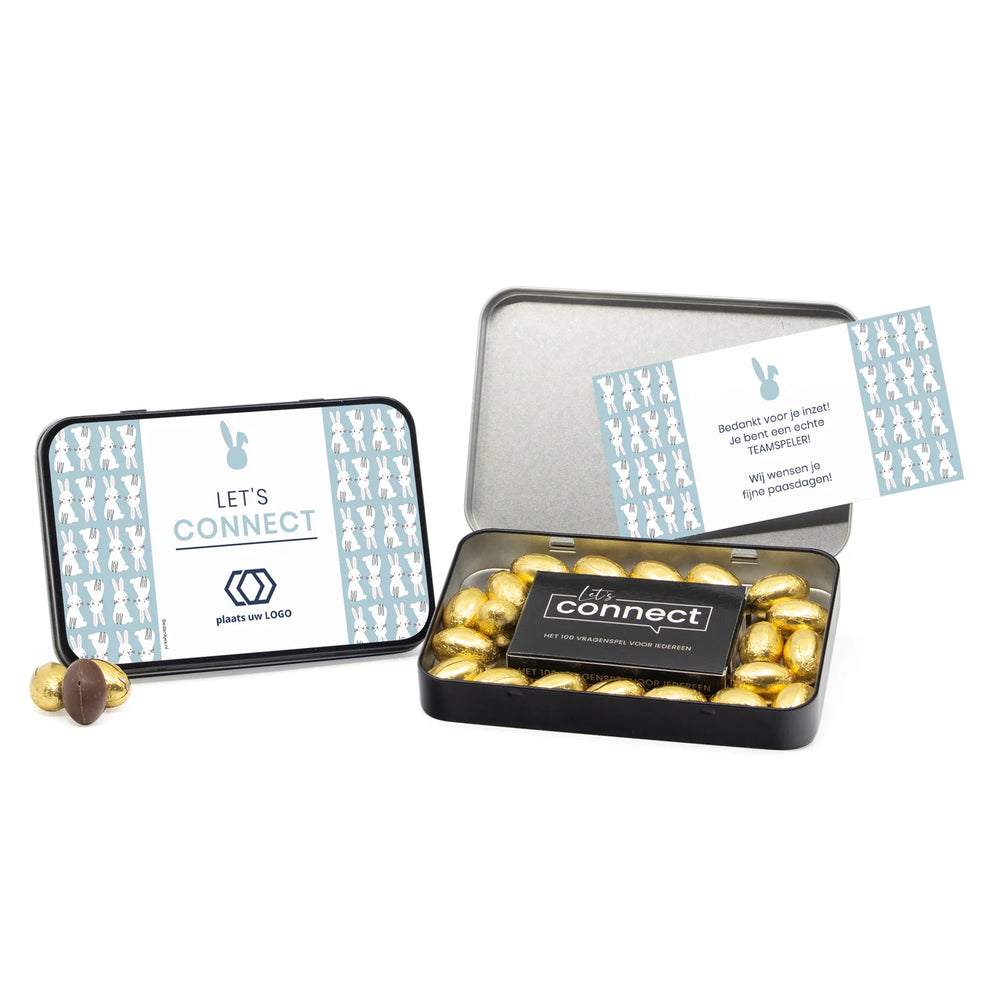 Ons eigen gemaakte Let's Connect 100 vragenspel verpakt in dit chique opbergblik bied je de mogelijheid om je familie, vrienden of collega's vanuit een andere invalshoek te leren kennen onder het genot van een heerlijk melkchocolade paaseitje. Voeg een leuke tekst en/of foto en verzorg een middag vol speelplezier tijdens de paasdagen!