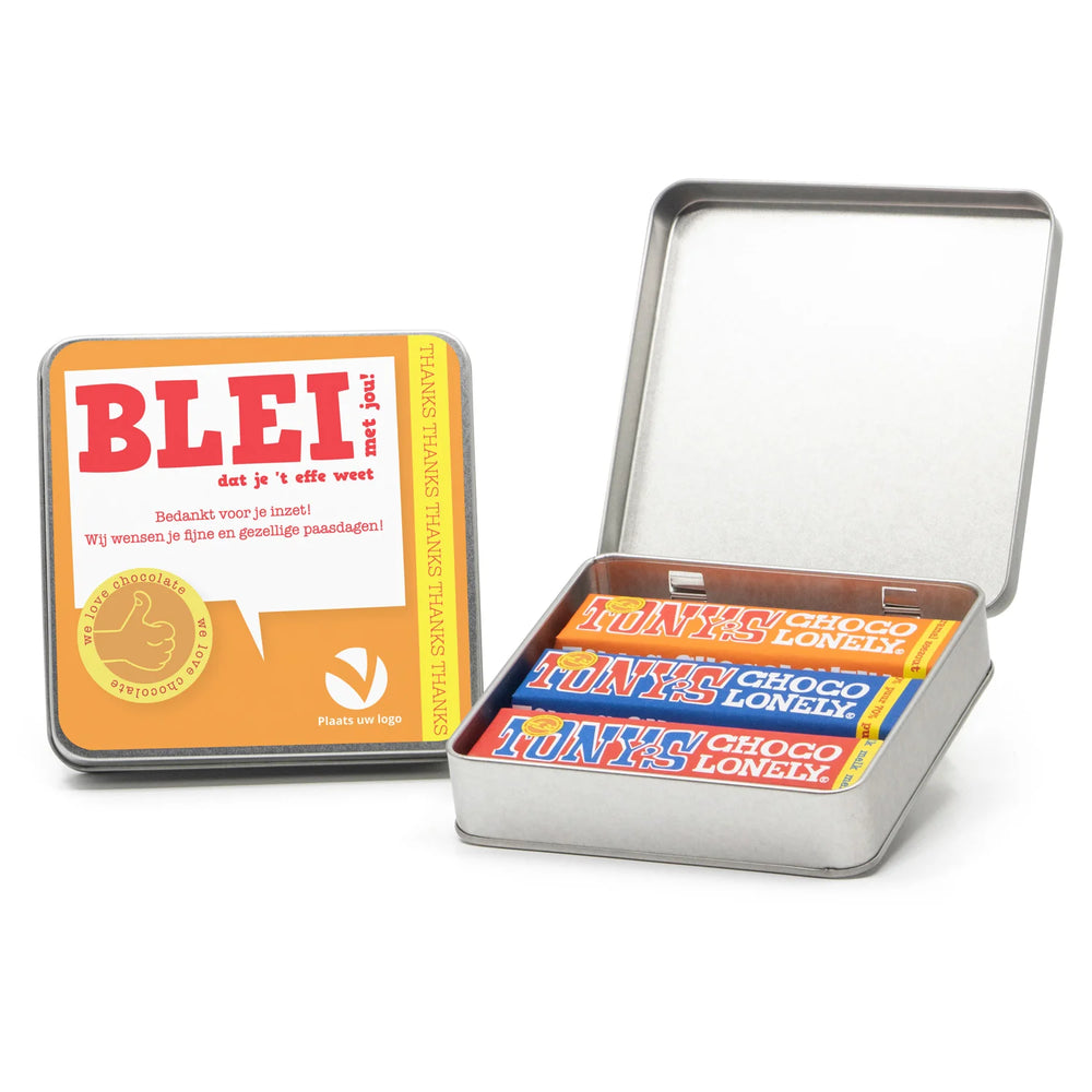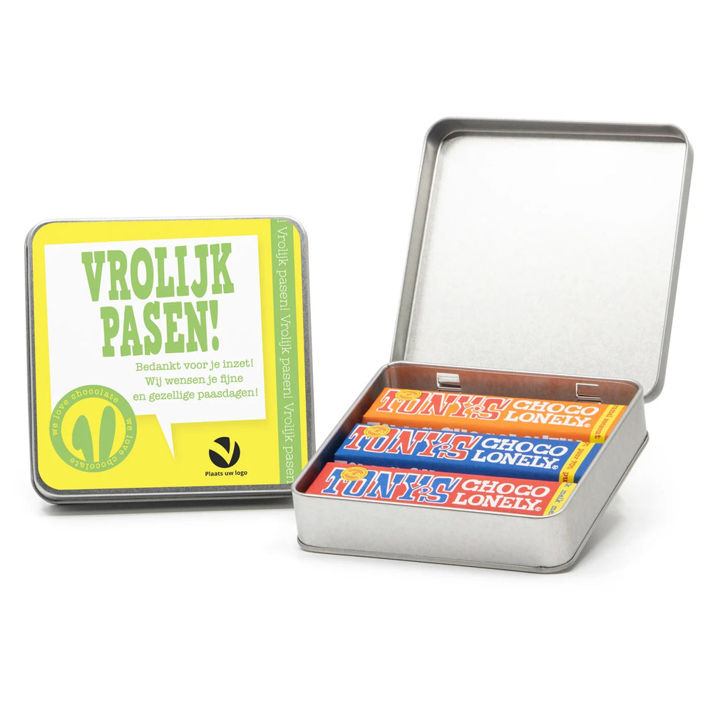 Een vierkant blik met drie verschillende Tony's Chocolonely repen van 50 gram, inclusief een persoonlijke boodschap op het deksel. Op het etiket kan een persoonlijke paasboodschap worden geplaatst. Wil je naast het persoonlijke etiket op het deksel nog een extra kaart met eigen tekst in het blik? Klik hier voor een 10x10cm kaart die we kunnen bijsluiten