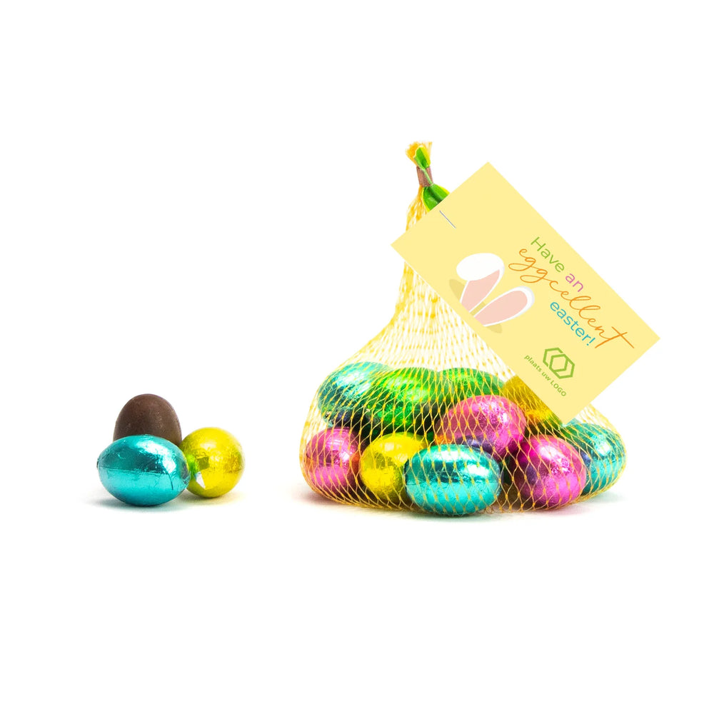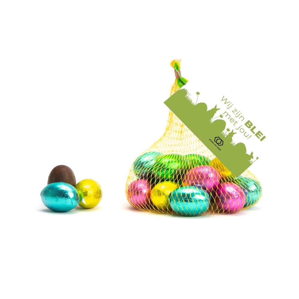 Een leuk en lekker weggevertje; 12 heerlijke chocolade paaseitjes in een netje inclusief een eigen kaartje die je zelf kunt personaliseren! Deze paaseitjes zijn per stuk verpakt in vrolijk gekleurde folie. De paaseitjes zijn fairtrade melkchocolade met een klein stukje hazelnoot crème vulling.