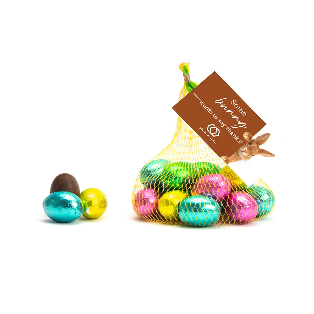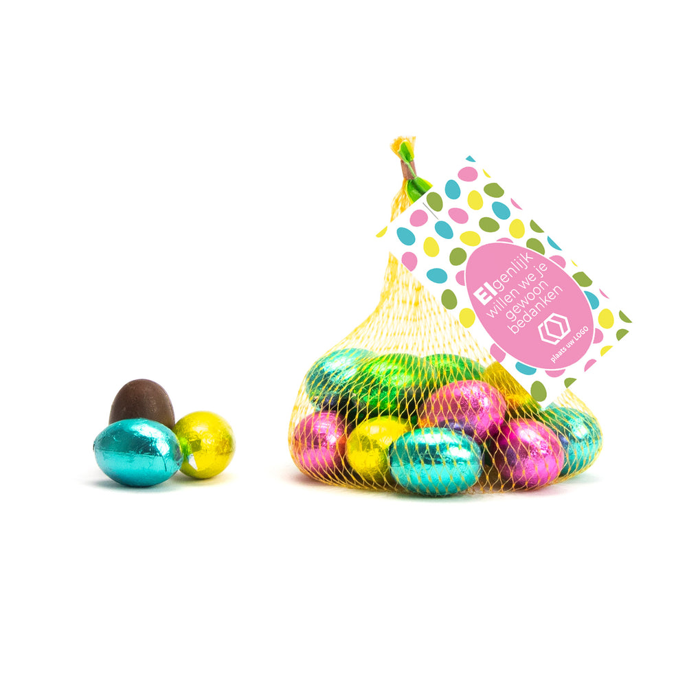 Een leuk en lekker weggevertje; 12 heerlijke chocolade paaseitjes in een netje inclusief een eigen kaartje die je zel... Lees meer