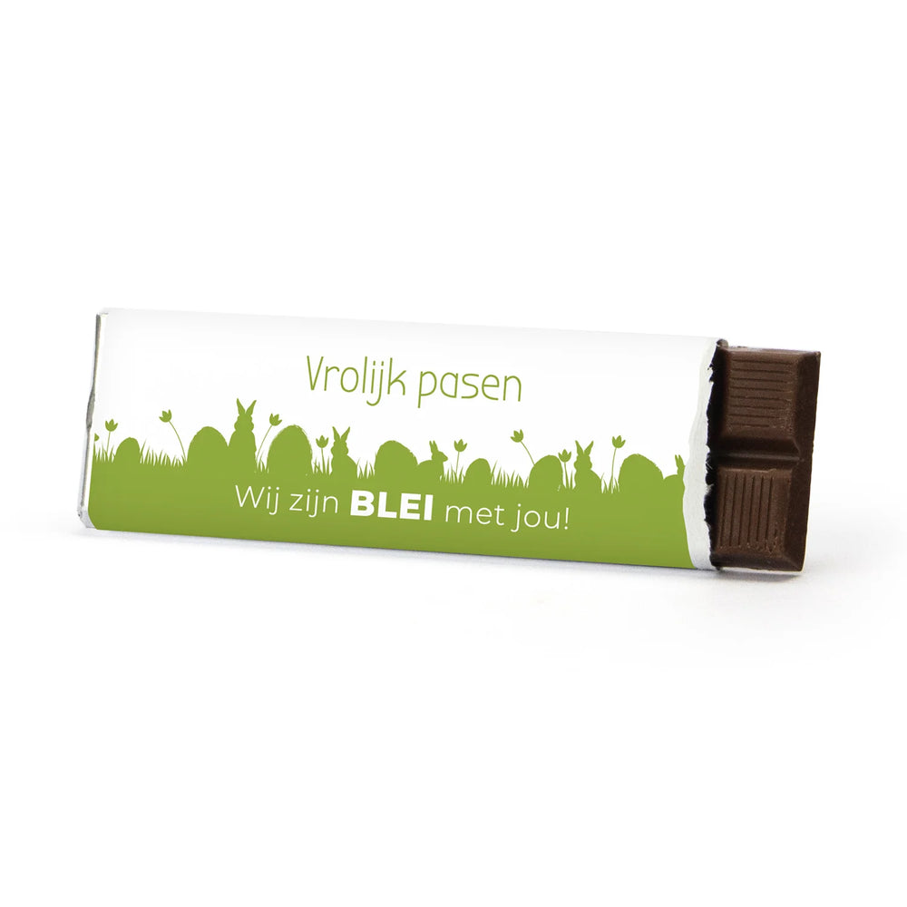 Heerlijke chocoladereep met een eigen wikkel waarop je jouw paasboodschap en/of logo kunt plaatsen. Leuk om uit te delen aan klanten of personeel met pasen. Kies een van onze kant-en-klaar ontwerpen of maak een geheel eigen ontwerp!