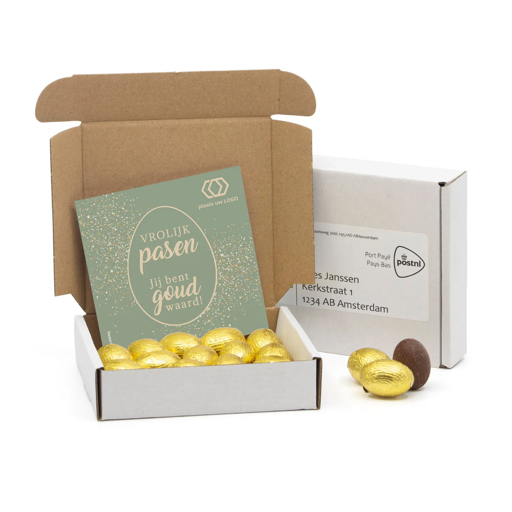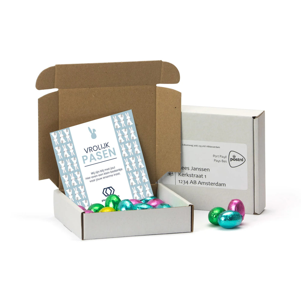Een leuk doosje met 150 gram melkchocolade paaseitjes en een persoonlijke kaart die je zelf online kunt ontwerpen.