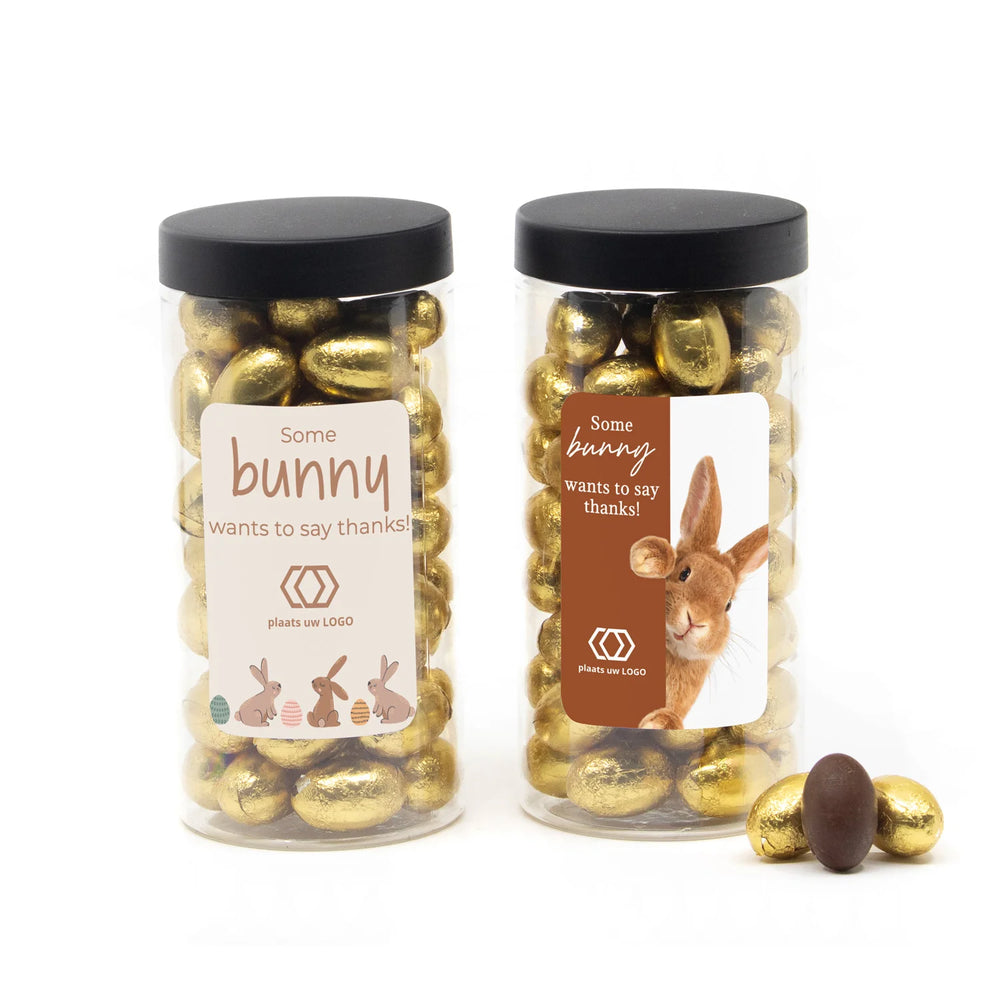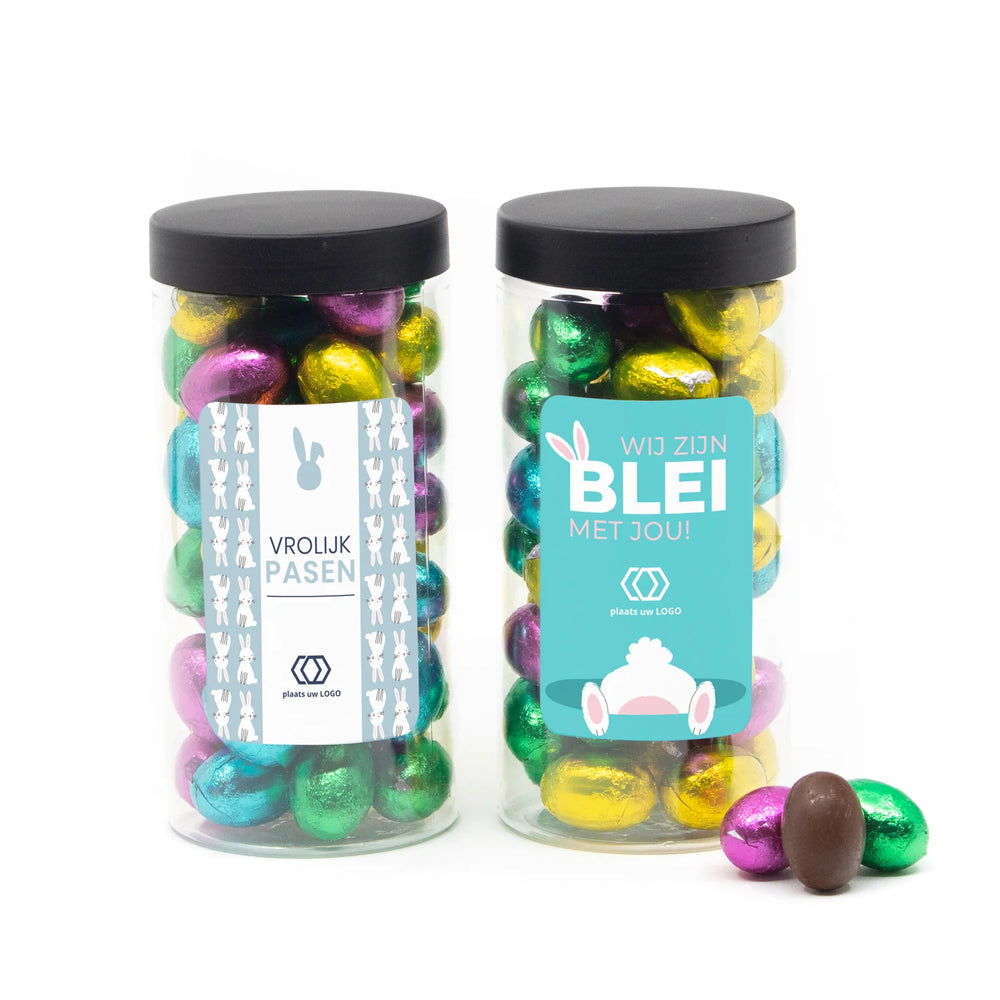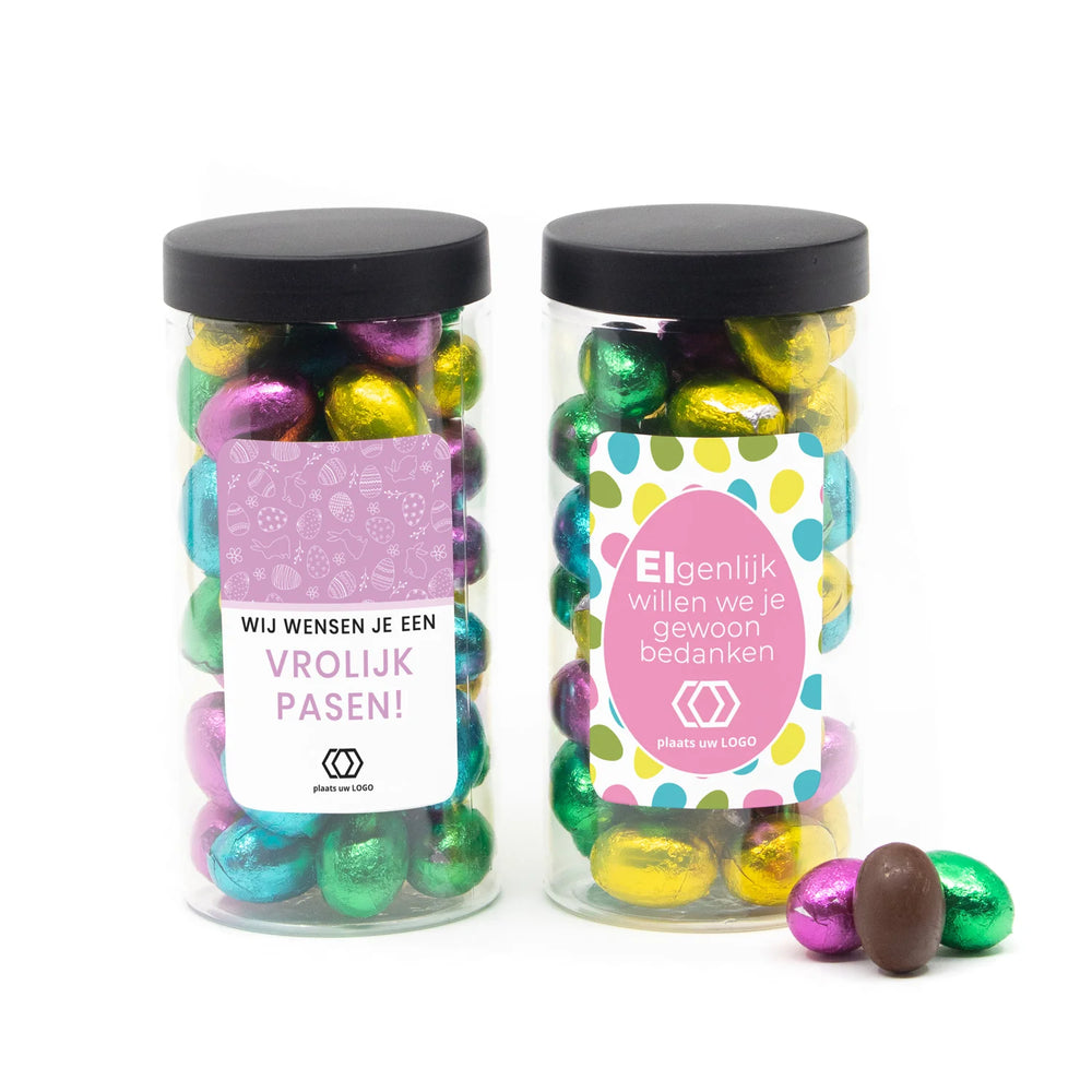 Een orgineel en leuk paasgeschenk om uit te delen aan klanten of collega's: een kunststof potje met maar liefst 350 gram paaseitjes en persoonlijk etiket.