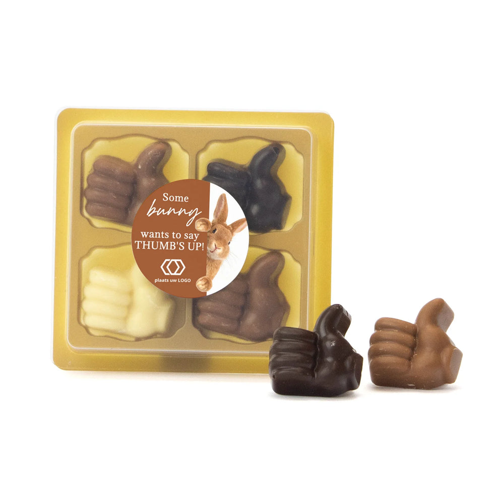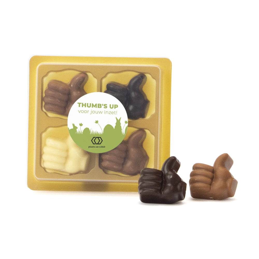 Thumb's Up! Een leuk doosje met 4 heerlijke massieve chocolade like duimpjes en persoonlijk paasetiket die je zelf on... Lees meer