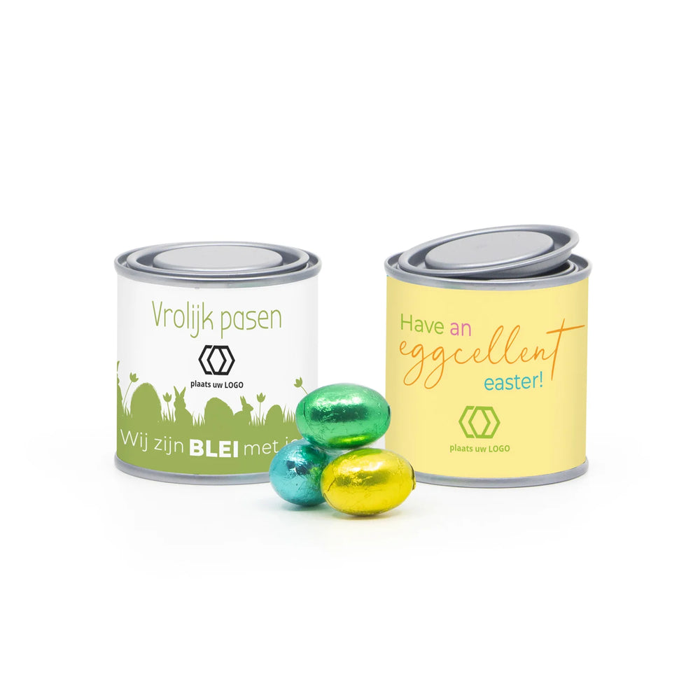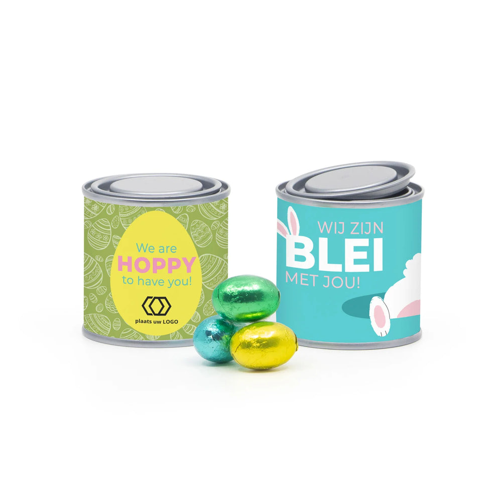 Een super leuk verfblikje gevuld met 100 gram melkchocolade paaseitjes. Het blikje voorzien we van een persoonlijk paaswikkel met eigen tekst en/of logo. Je kunt deze eenvoudig personaliseren in onze ontwerptool.