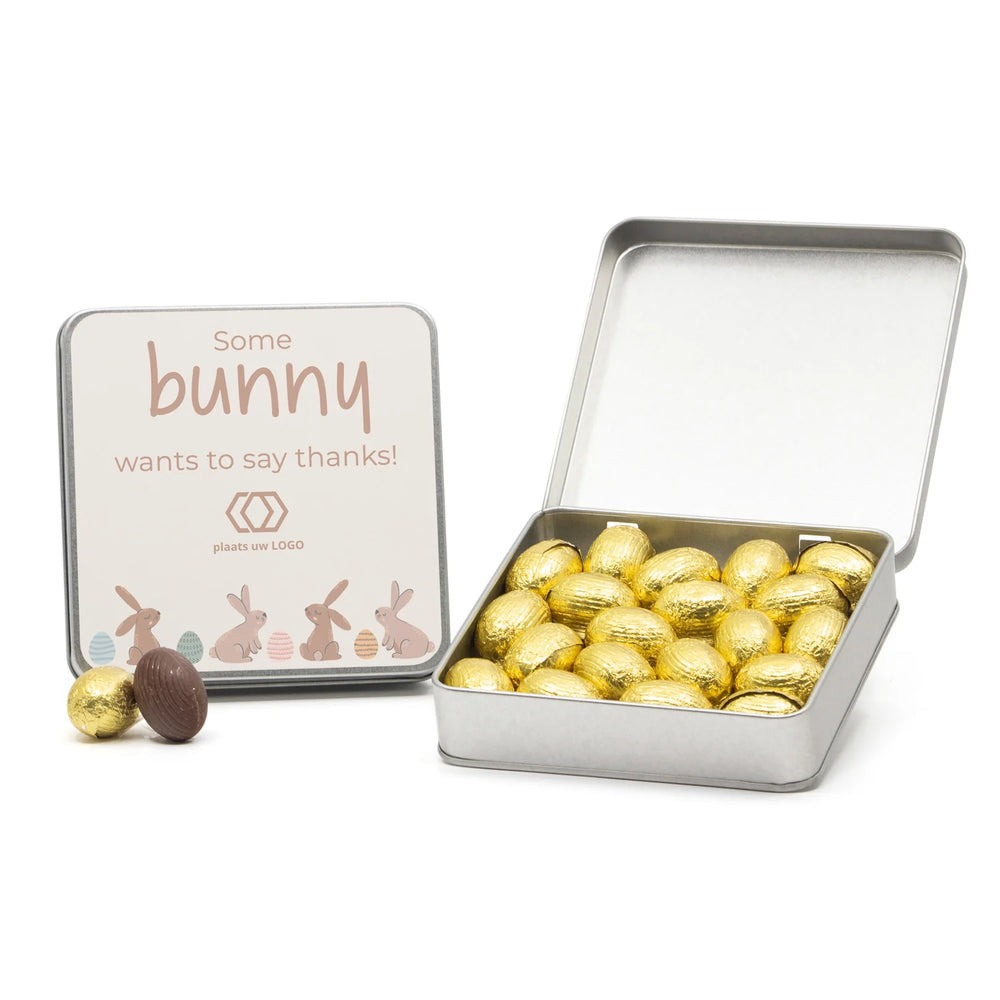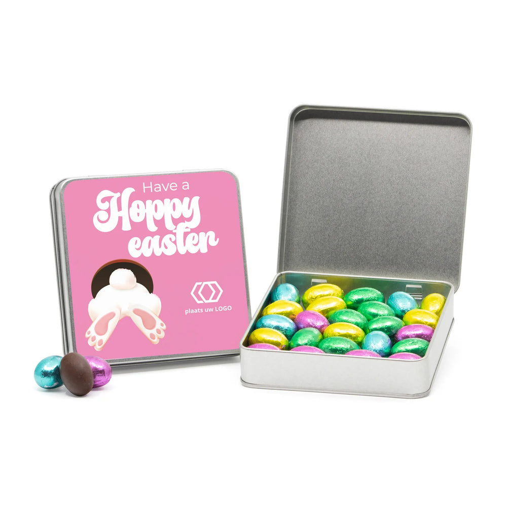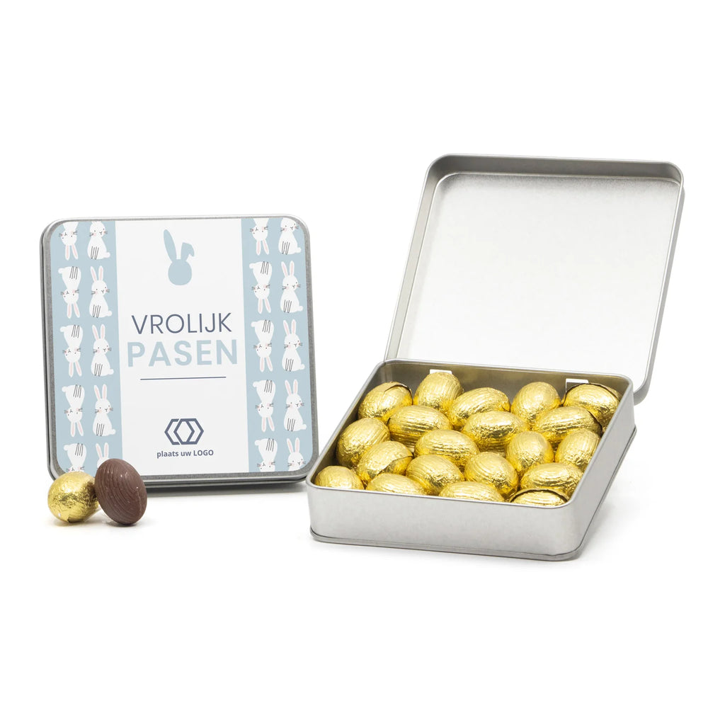 Vierkant blik met 185 gram melkchocolade paaseitjes, inclusief een persoonlijke boodschap op het deksel. Op het etiket kan een persoonlijke tekst en/of je logo worden geplaatst, dit kun je doen in onze ontwerptool.
