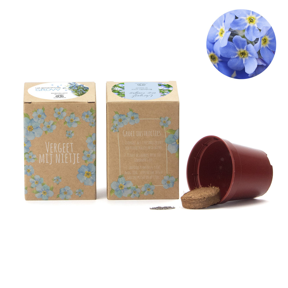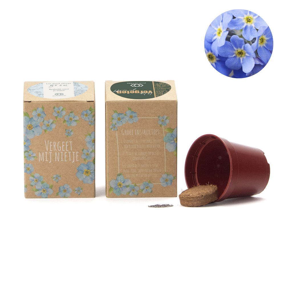Dit kweeksetje is een passende herinnering en bevat een compleet setje om vergeet-mij-nietjes te kweken. De instructies staan achterop het doosje. Het is verpakt in een natuurlijk kraftdoosje.