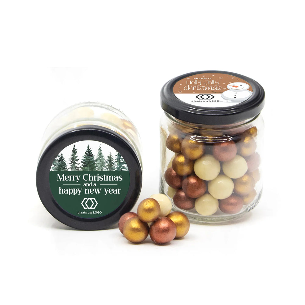 Een glazen potje gevuld met heerlijke chocolade kerst pearls is een heerlijke traktatie met een luxe uitstraling. Maak het extra persoonlijk met een eigen etiket, eenvoudig te ontwerpen in onze online ontwerptool. Ook leuk om toe te voegen aan jouw eigen kerstpakket. Fijne feestdagen!