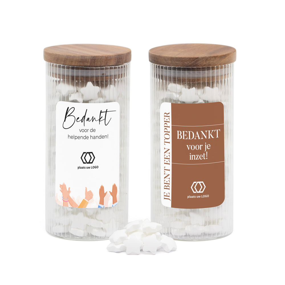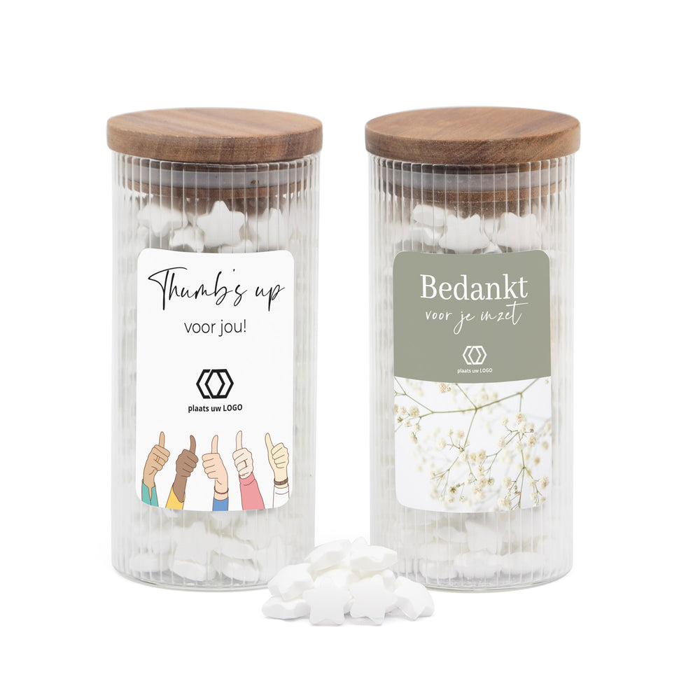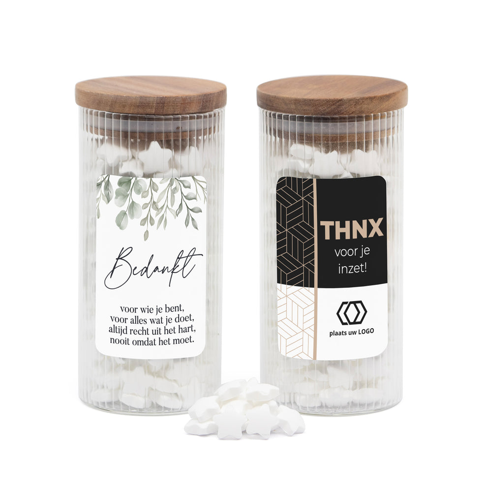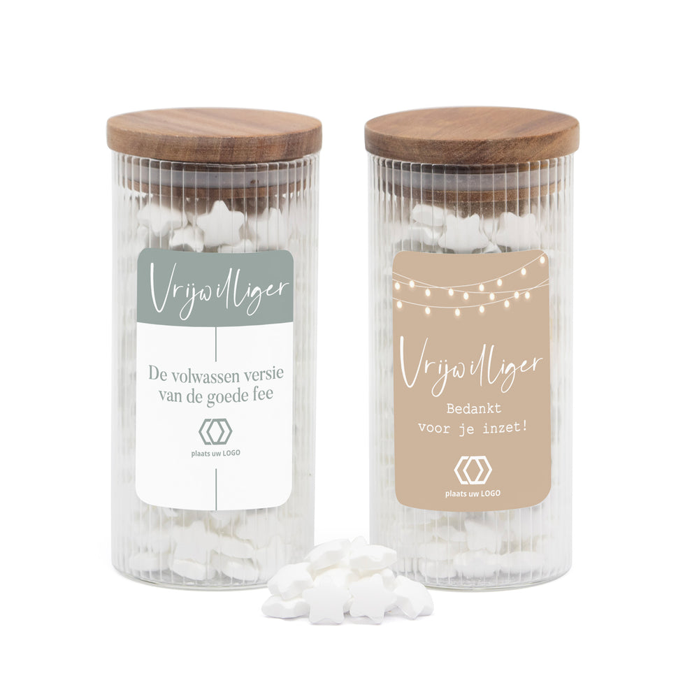 Verras jouw vrijwilligers met dit luxe en duurzame geschenk dat waardering uitstraalt. De glazen voorraadpot met ribbelglas en een deksel van acaciahout is gevuld met een snoepsoort naar keuze. Na het genieten van de inhoud is de pot herbruikbaar bijvoorbeeld als bewaarpot.