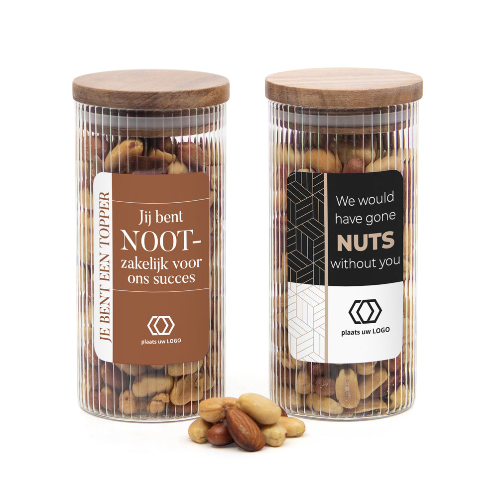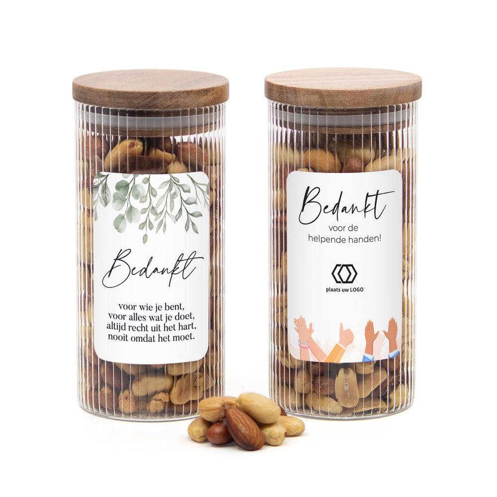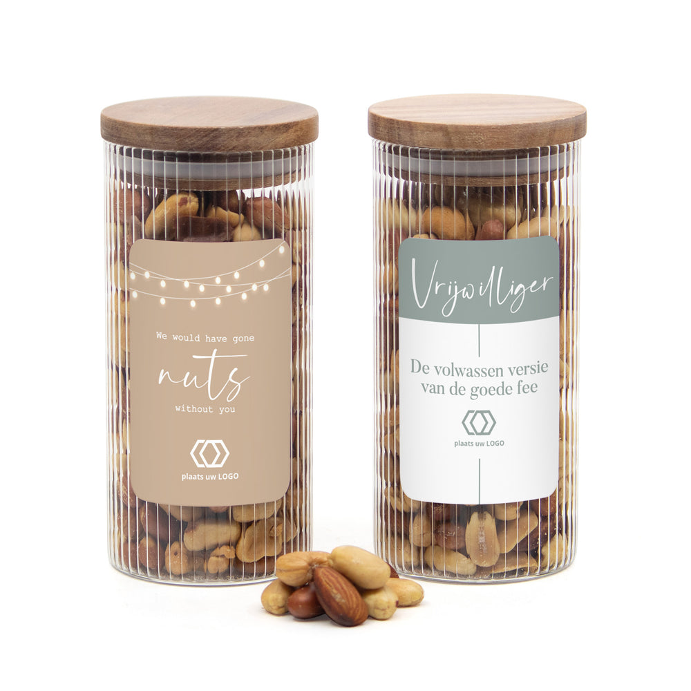 Verras jouw vrijwilligers met een stijlvol en smaakvol bedankje dat waardering uitstraalt. Deze luxe glazen pot met ribbelglas en een acaciahouten deksel is gevuld met een heerlijke verse notenmix. Een verantwoord én lekker vrijwilligerscadeau dat altijd goed in de smaak valt.