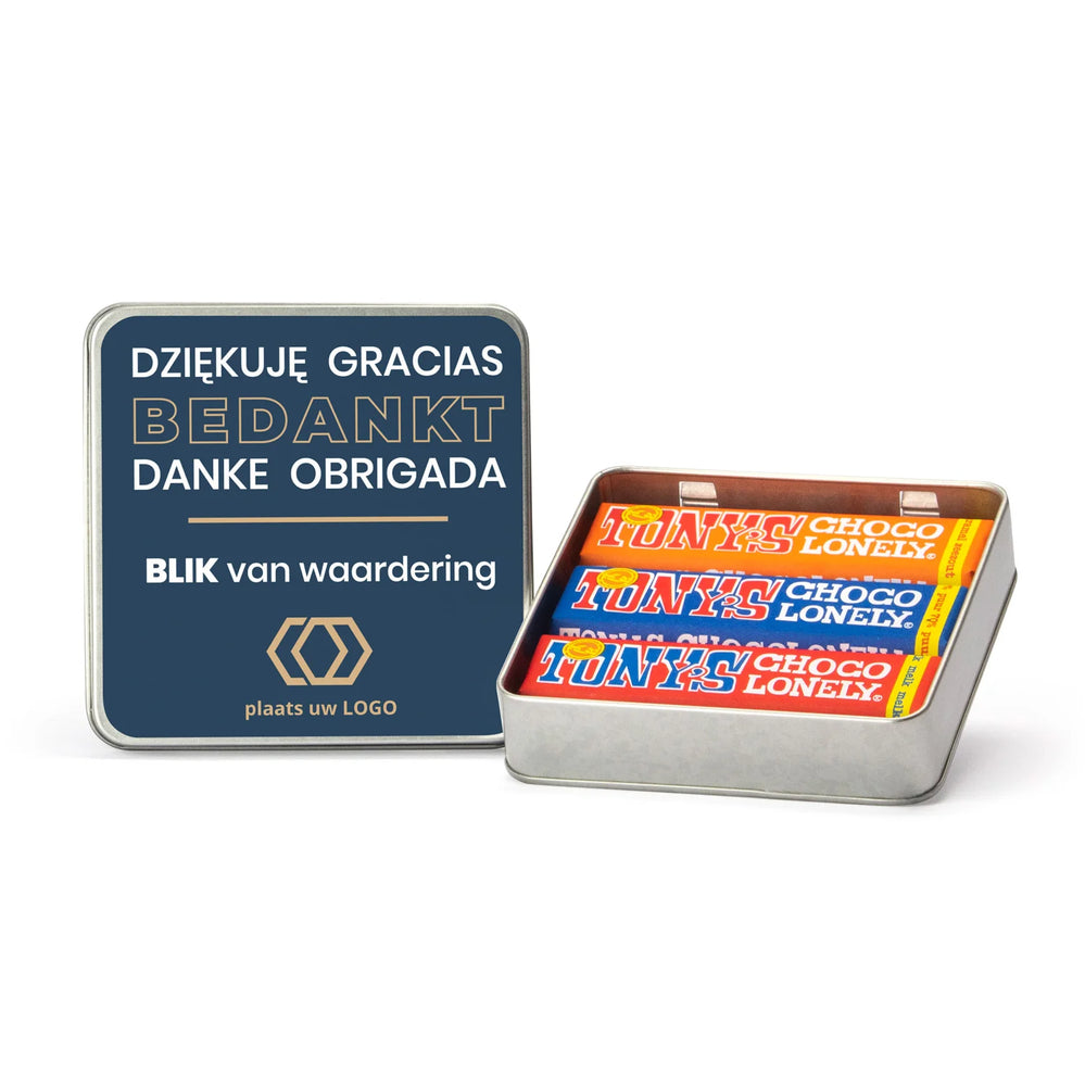 Een vierkant blik met drie verschillende Tony's Chocolonely repen van 50 gram, inclusief een persoonlijke boodschap op het deksel. Op het etiket kan een persoonlijke tekst en/of je logo worden geplaatst. Wil je nog een extra kaart met eigen tekst in het blik? Klik hier voor een 10x10cm kaart die we kunnen bijsluiten.
