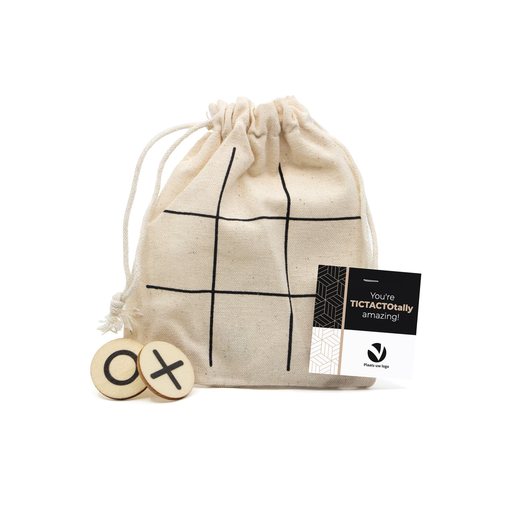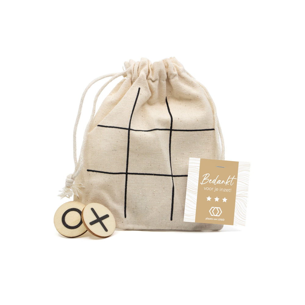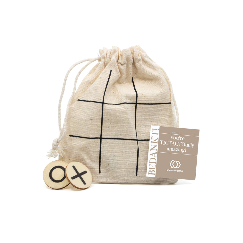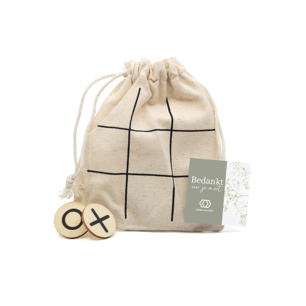 Daag je personeel, klant of zakenrelatie uit voor een ouderwets spelletje boter-kaas-en-eieren/ tic tac toe. Laat jouw waardering op een originele manier blijken en zorg via dit bedankje voor een beetje afleiding en ontspanning op de werkvloer! Het zakje leveren wij met een persoonlijke kaartje eraan. Dit kaartje personaliseer je gemakkelijk zelf via onze online ontwerptool!