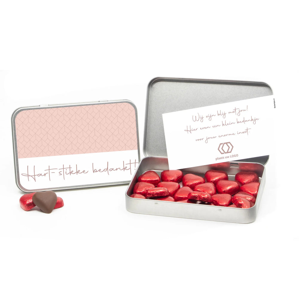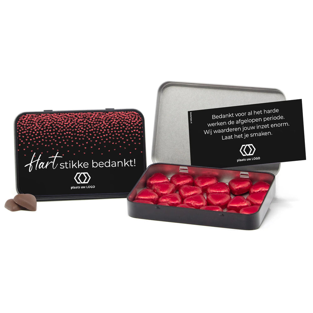 Chocolade harten in blik met persoonlijke kaart - Zakelijk