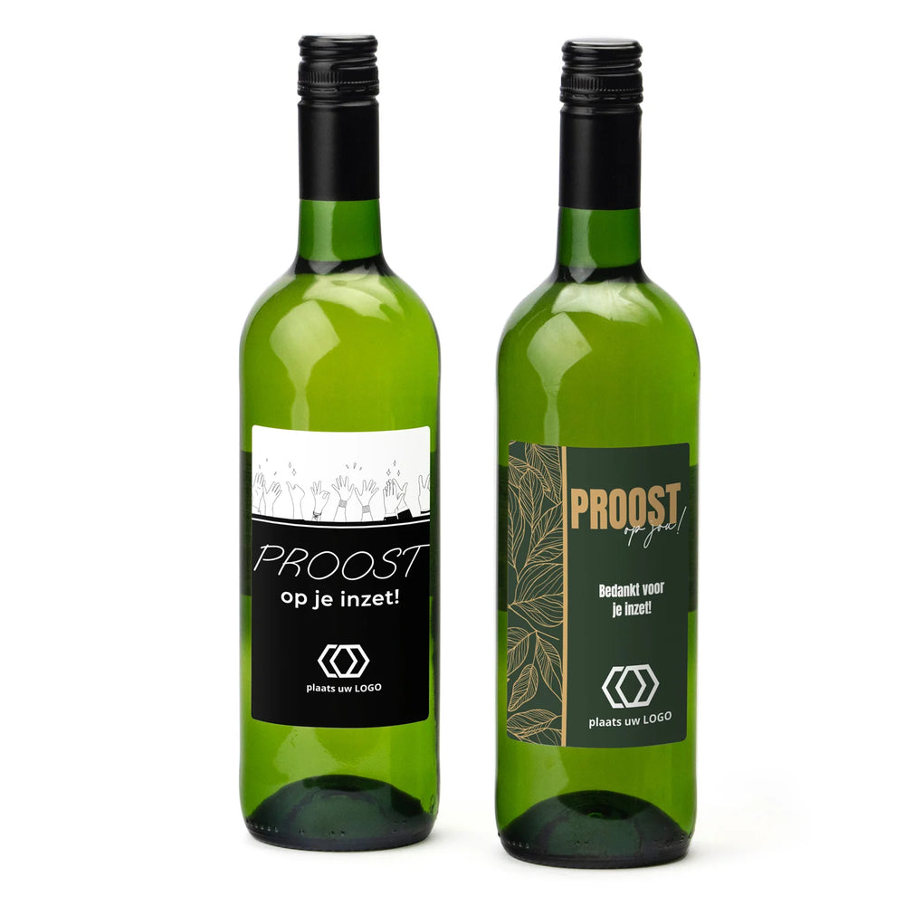 Een fles witte wijn met eigen logo en/of tekst op het etiket. Altijd leuk om te geven en lekker om te krijgen, maar d... Lees meer
