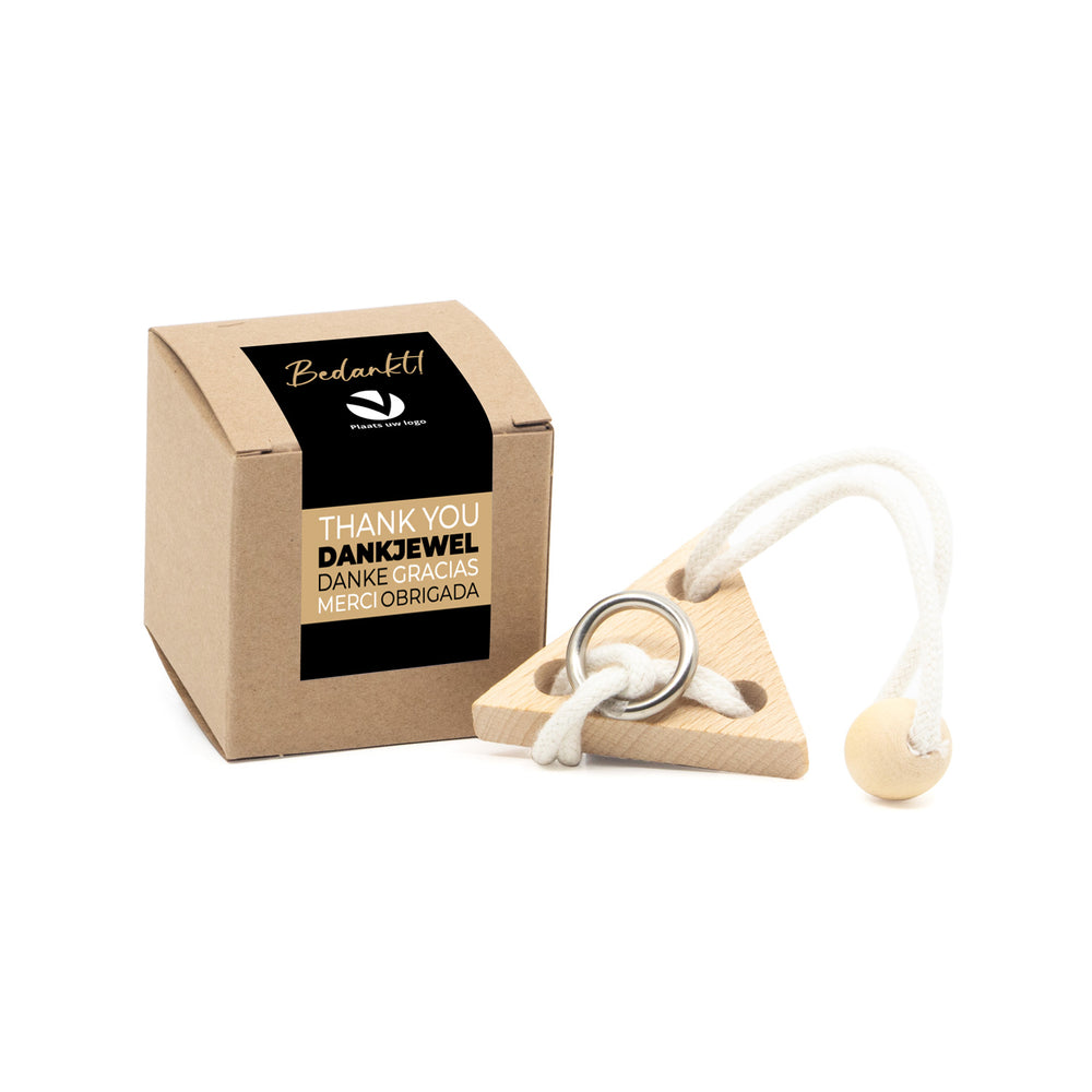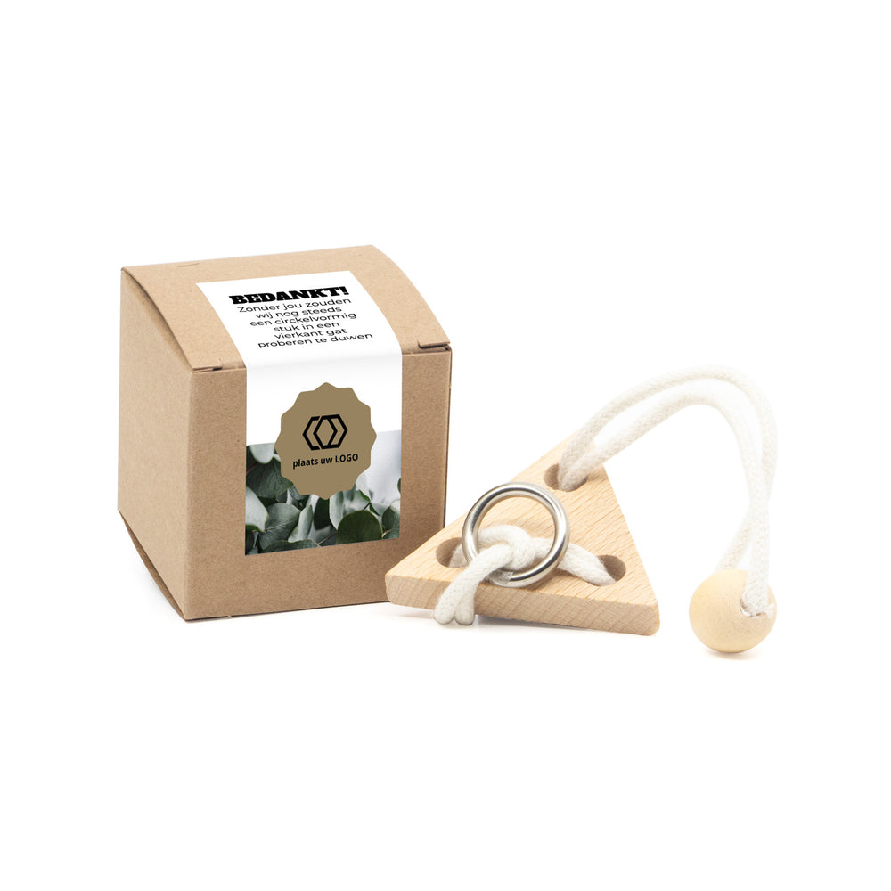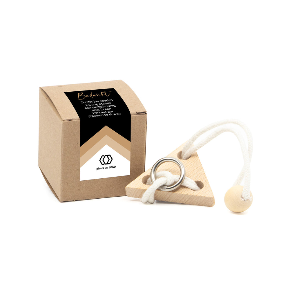 Een uitdagende houten breinbreker in een stijlvol kraft kubusdoosje. Het doosje voorzien we van een persoonlijk etiket dat je eenvoudig zelf kunt ontwerpen in onze online ontwerptool. Zo maak je van dit puzzeltje een origineel, bruikbaar én persoonlijk cadeautje – perfect voor al je personeel die wel van een uitdaging houden!