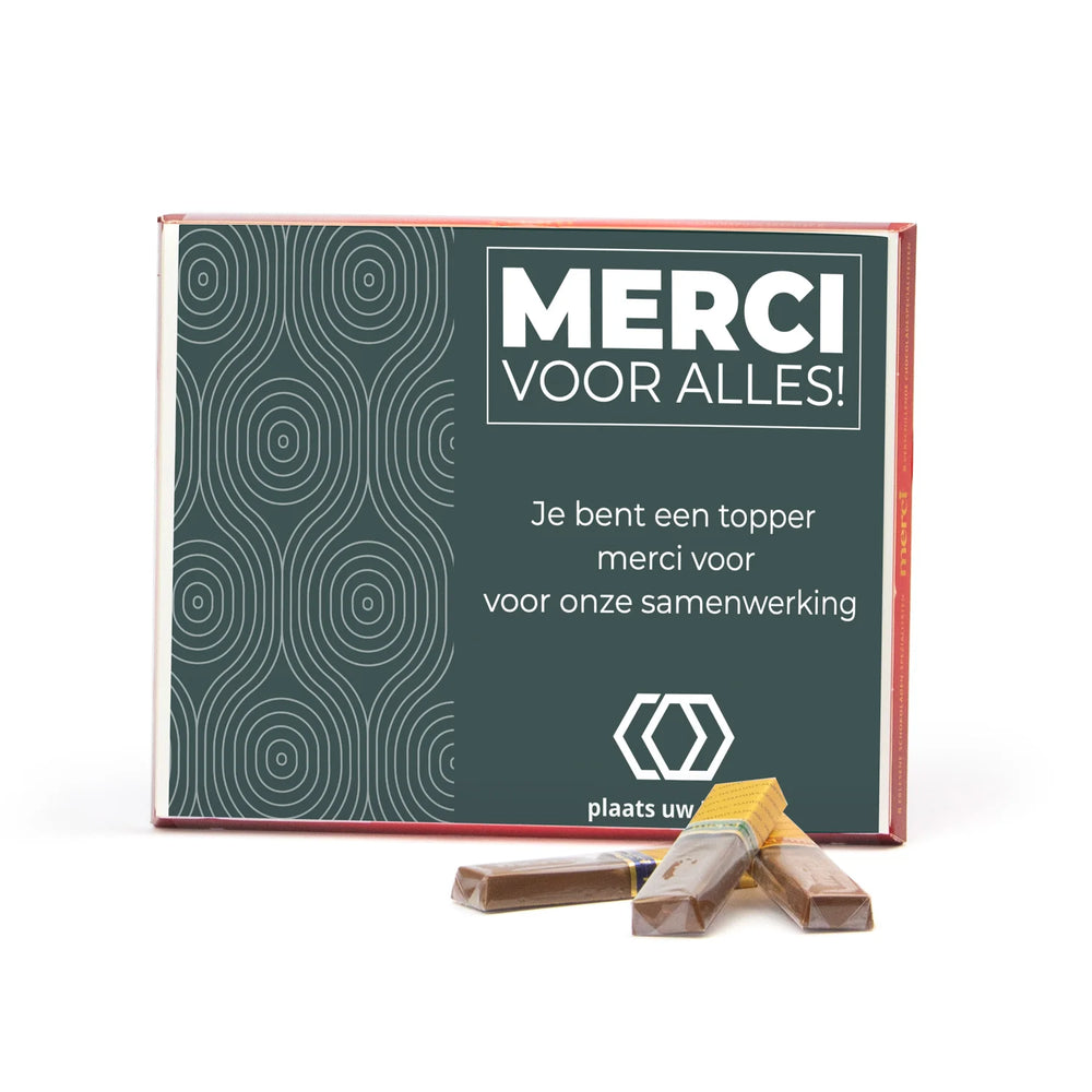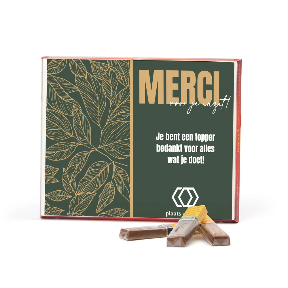 Merci voor je inzet. Deze doos met 250 gram heerlijke Merci chocolaatjes voorzien wij van een persoonlijke inlay kaart die je zelf kunt ontwerpen.