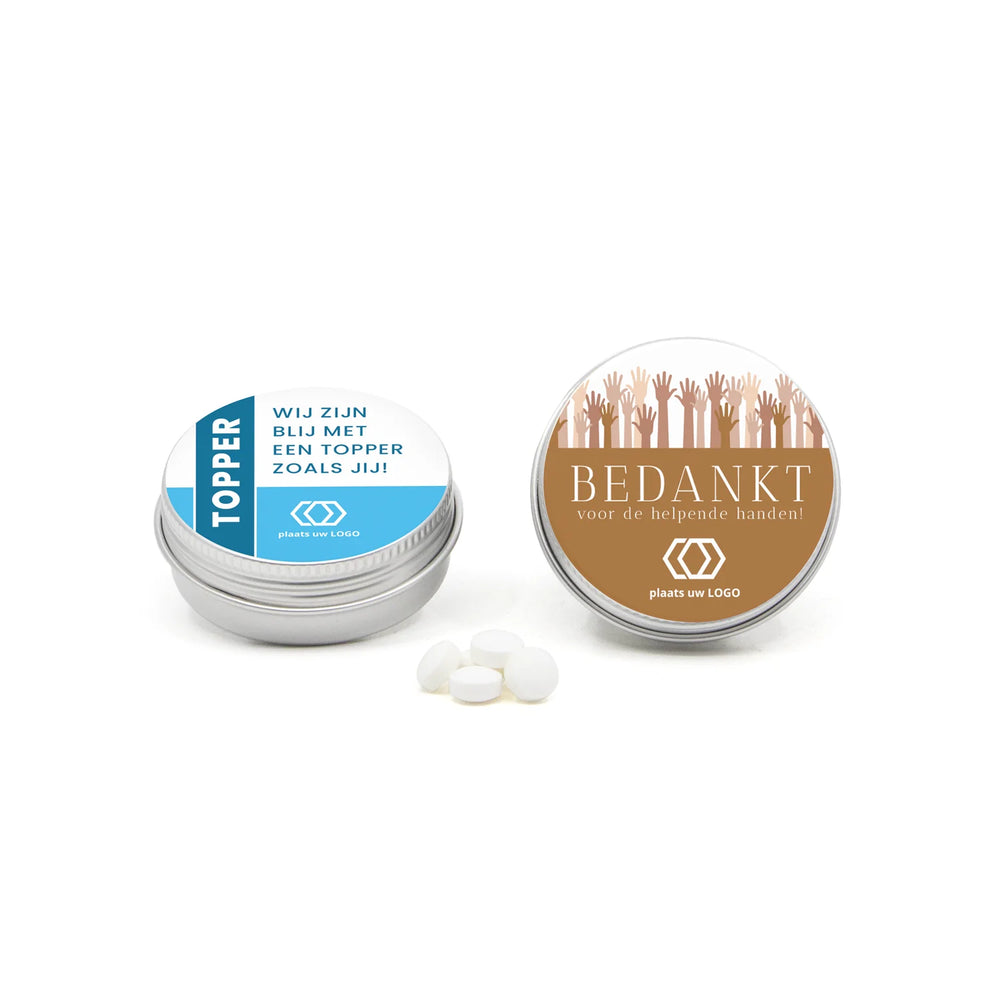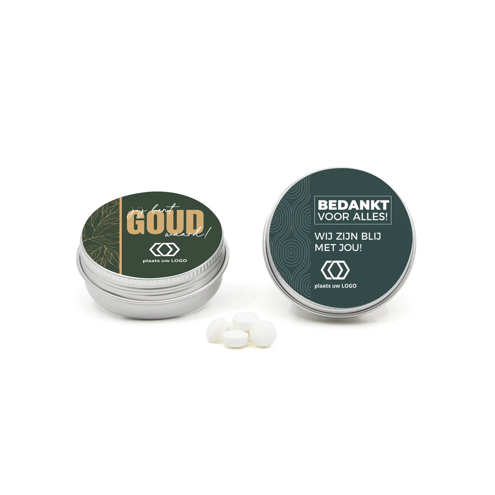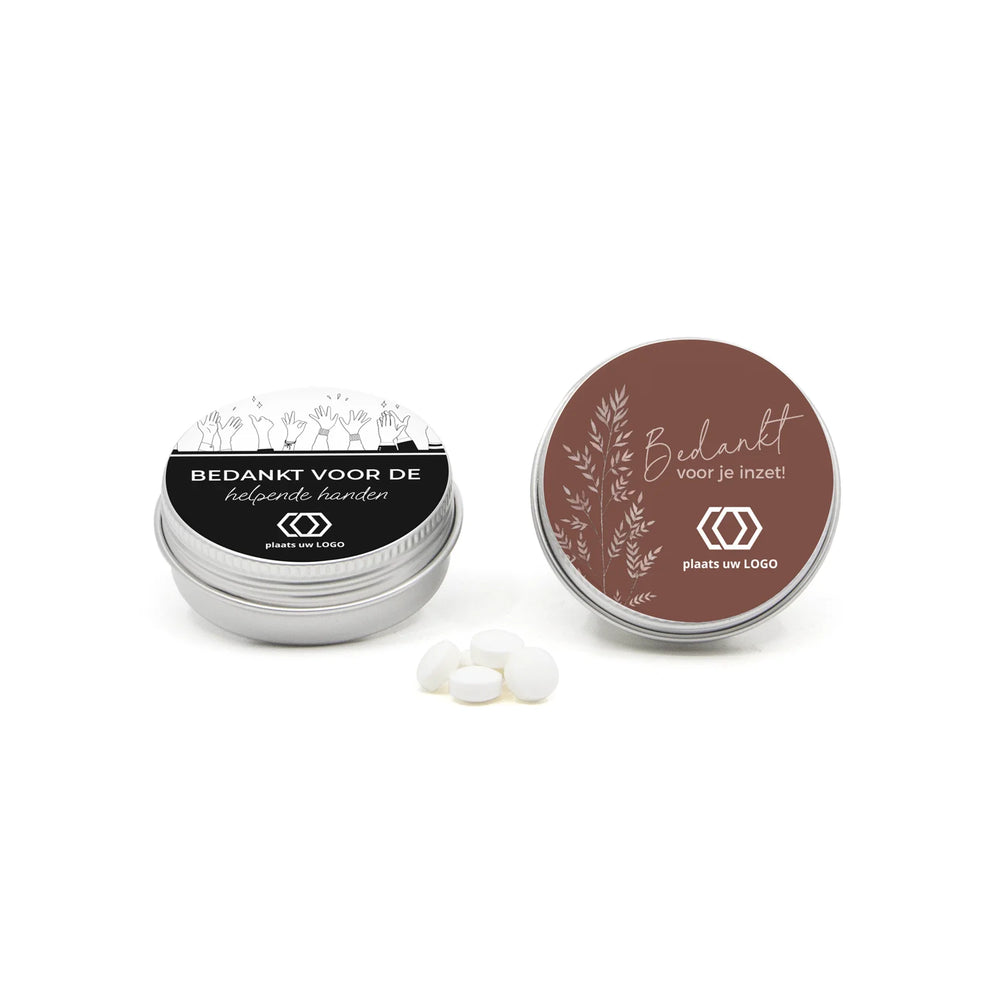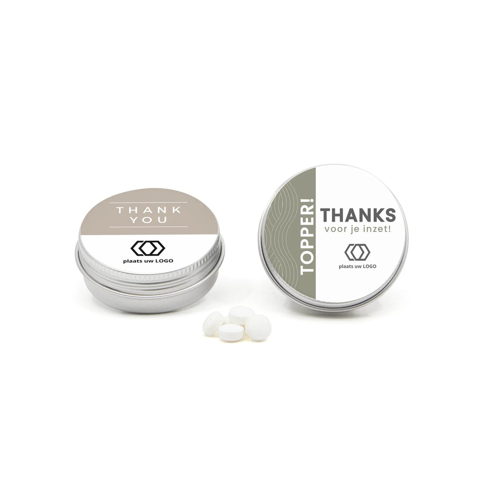 Our complimints! Deze leuke aluminium blikjes met frisse mintjes en een etiket voor op het deksel die je helemaal kunt personaliseren met een eigen tekst en/of logo.