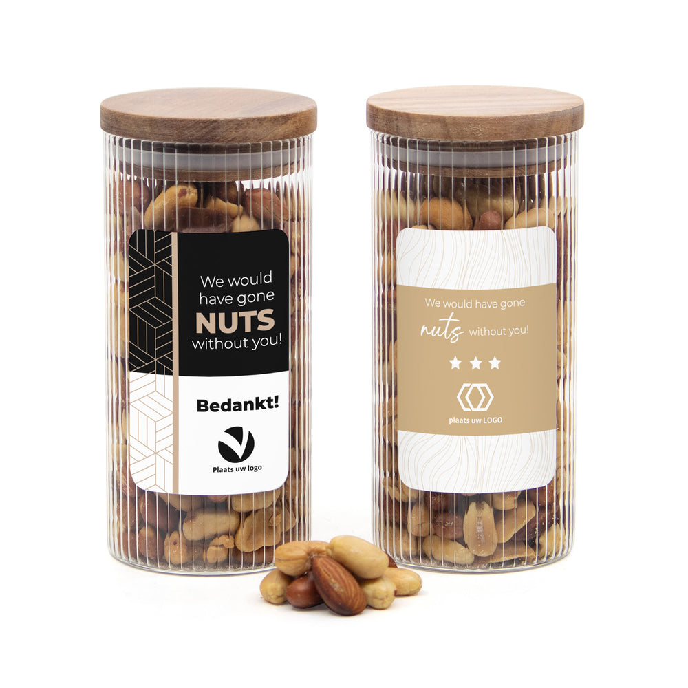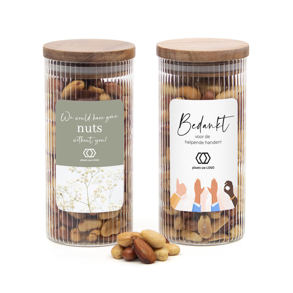 Verras je personeel of klanten met dit stijlvolle bedankje dat zowel lekker als duurzaam is. De glazen voorraadpot met elegant ribbelglas en een deksel van acaciahout is gevuld met 200 gram verse notenmix. Een traktatie die direct in de smaak valt én daarna nog lang gebruikt kan worden als bewaarpot in huis of op kantoor.