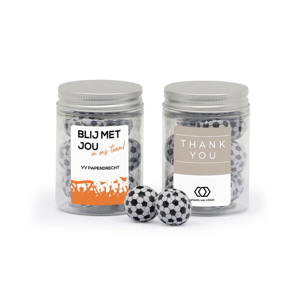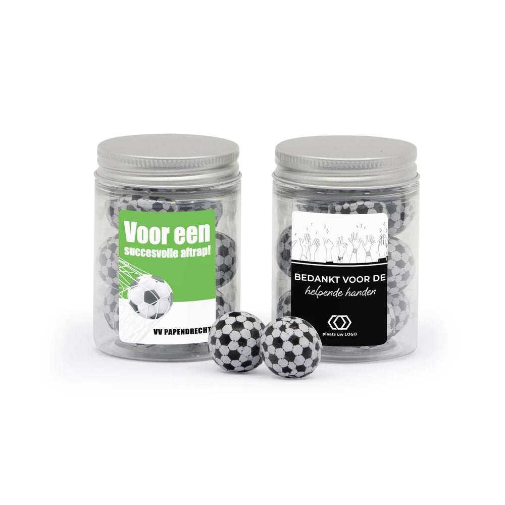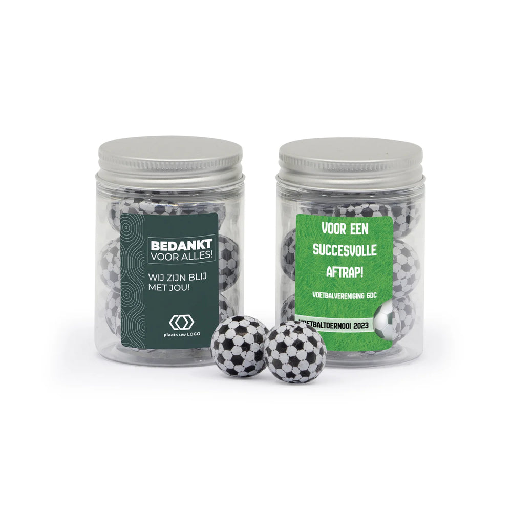 Potje voetballen? Een leuk bedankje voor een voetbalvereniging of teamuitje. Kunststof potje met aluminium deksel met 11 chocolade voetballetjes. Wij leveren de potjes met een persoonlijk etiket die je zelf kunt opmaken in onze ontwerptool.