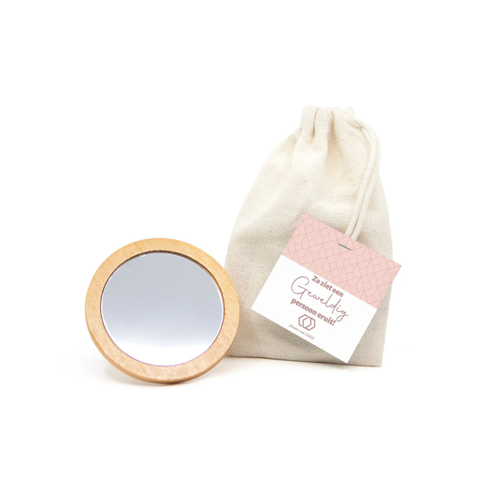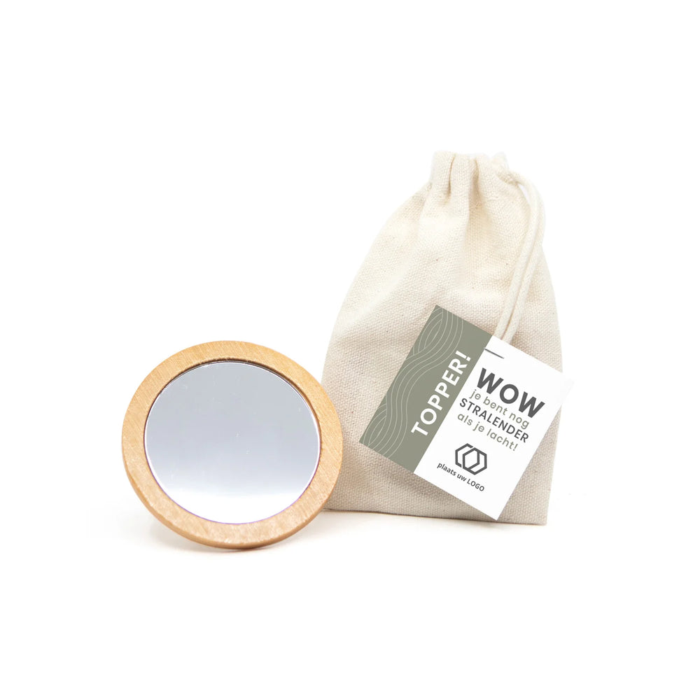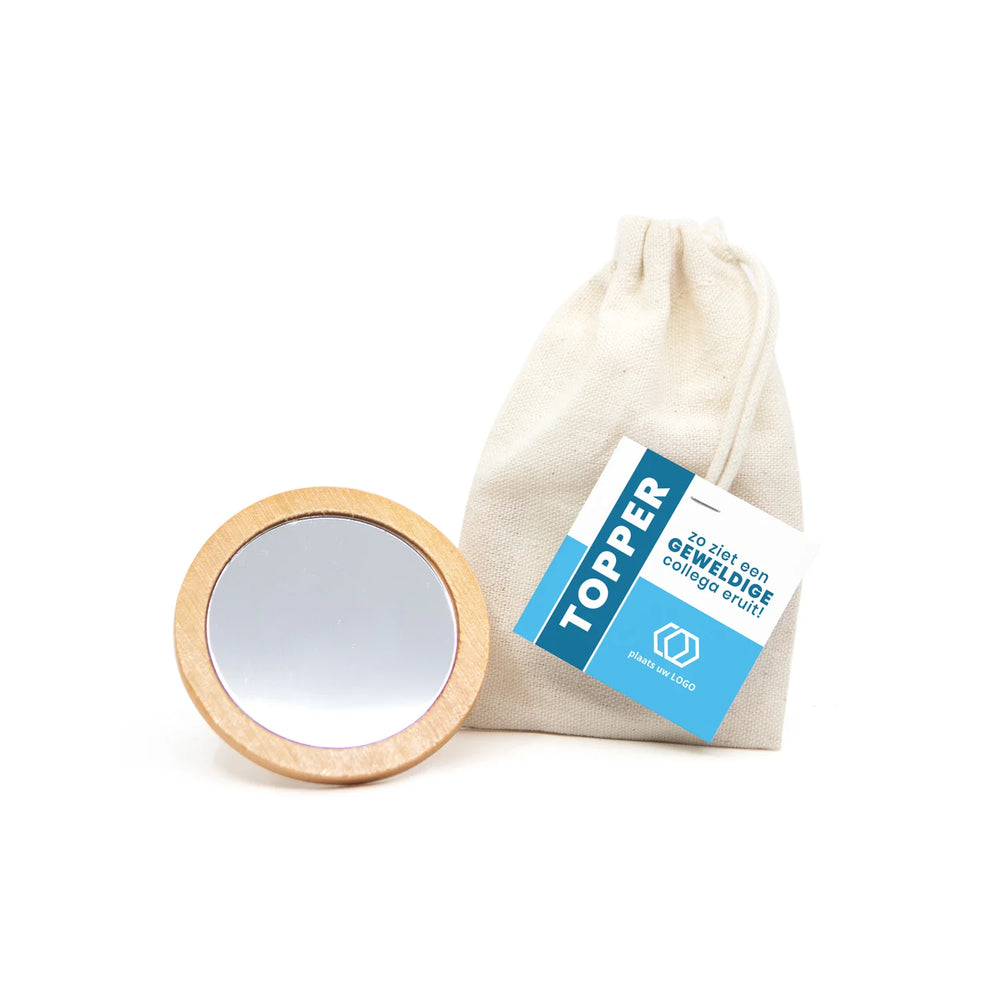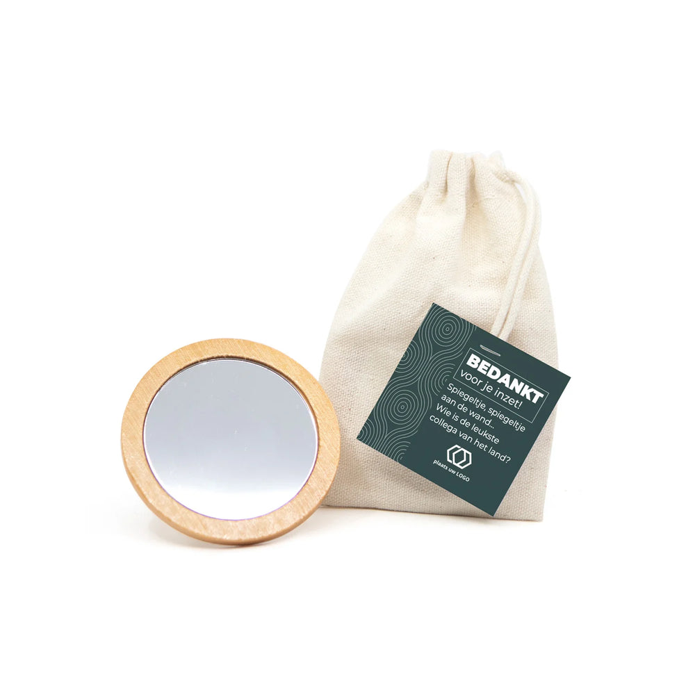 Een bamboe spiegeltje, verpakt in een katoenen zakje en voorzien van een persoonlijk kaartje dat je helemaal zelf ontwerpt via onze online tool. Voeg een persoonlijke boodschap, naam of bedanktekst toe en geef een klein cadeau met een groots gebaar.