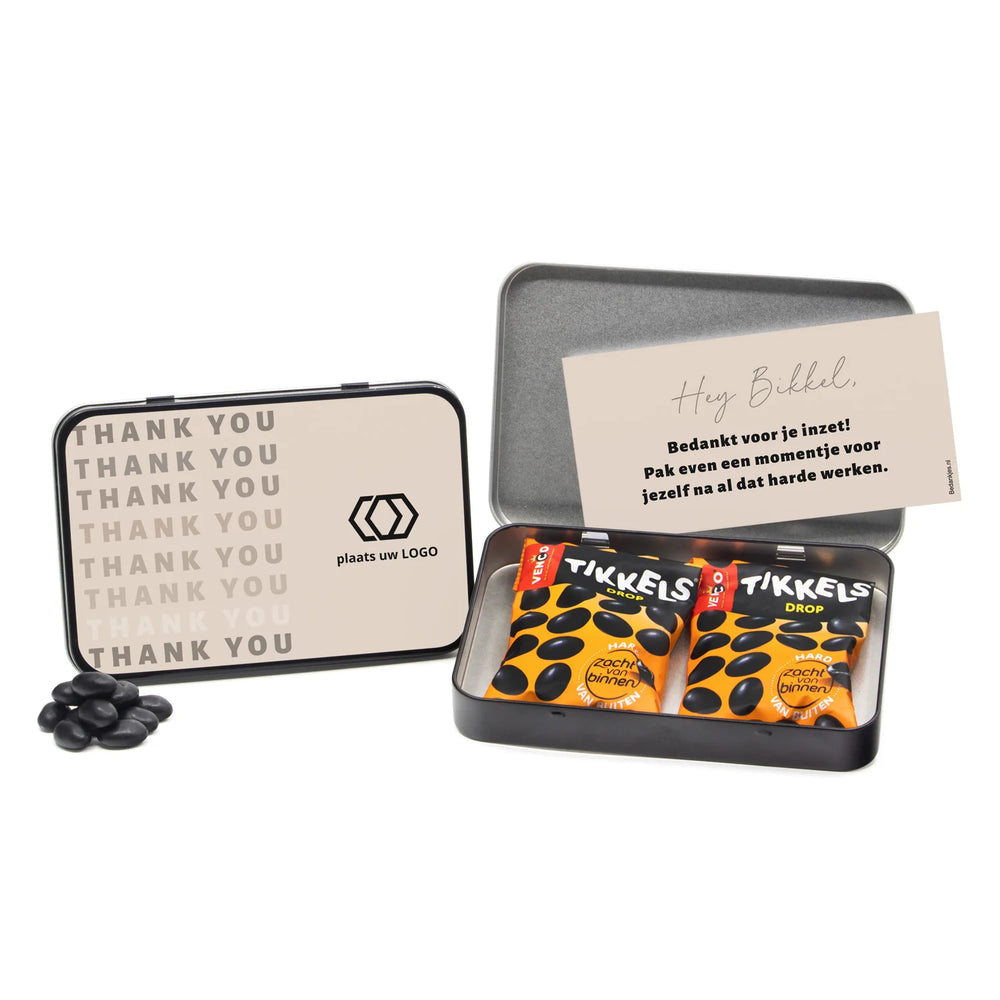 Hebben de bikkels in jullie bedrijf zich volledig ingezet voor een project? Verras ze met dit chique A6-blik, gevuld met twee zakjes Venco Tikkels en voorzien van een persoonlijk etiket. Voeg een eigen boodschap of foto toe op de kaart en dekselsticker en maak er een uniek bedankje van.