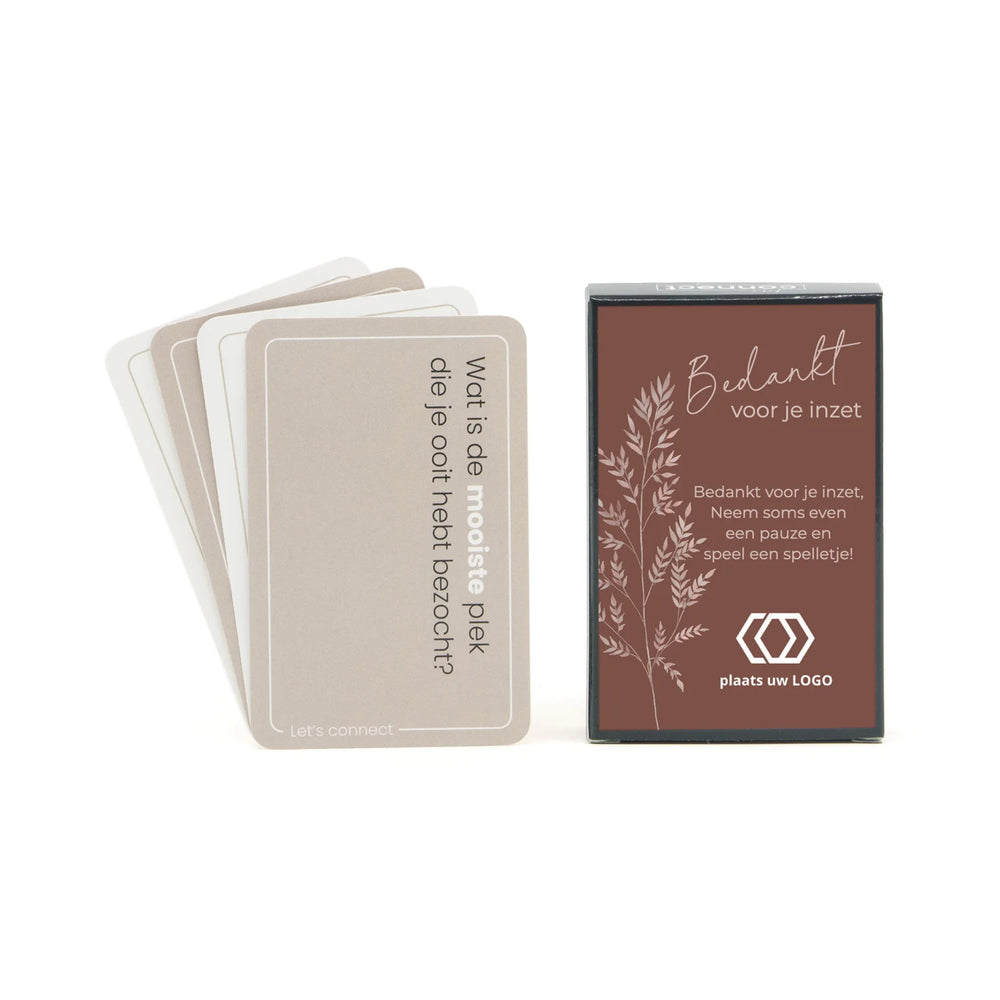 Vanaf 250 stuks is het mogelijk om zowel een geheel persoonlijk bedrukte verpakking als bedrukte kaarten te laten maken. Of eventueel zelfs een aantal eigen vragen. De levertijd bedraagt ca. 2–3 weken na goedkeuring van de proefdruk. Neem gerust contact met ons op via zakelijk@bedankjes.nl om de mogelijkheden te bespreken.