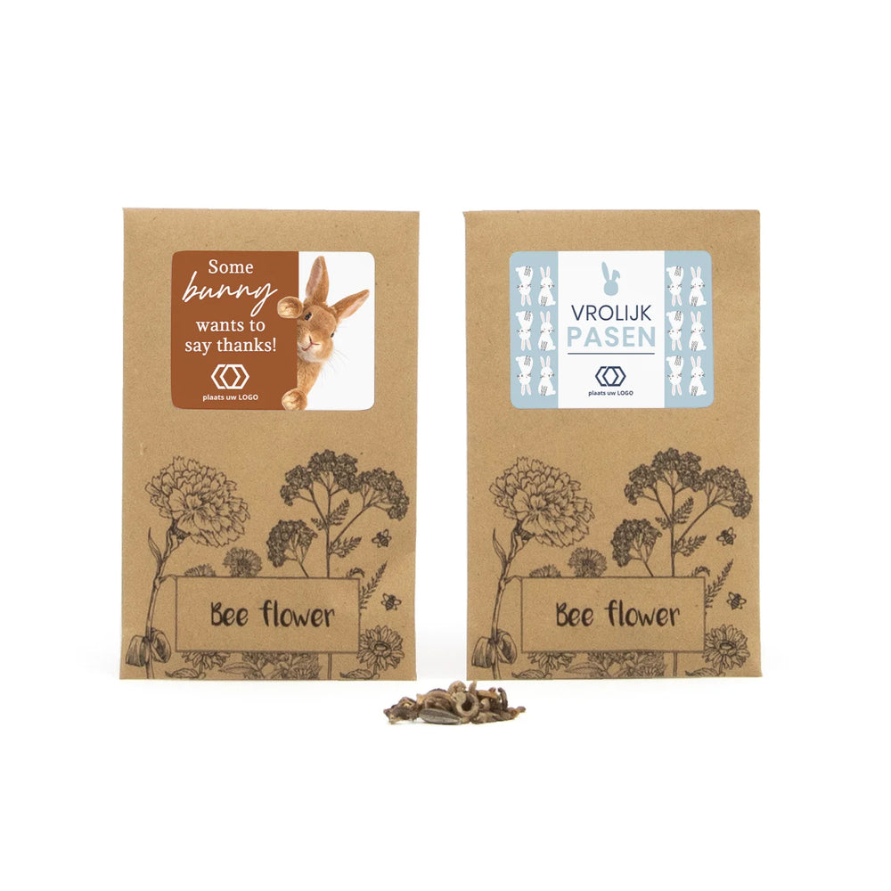 Een bedankje met impact, perfect weggevertje voor de pasen! Een kraft envelopje gevuld met zaadjes voor gemengde bijen-bloemzaden. Een persoonlijk en fleurig bedankje met impact! Maak het persoonlijk door je eigen etiket te maken via onze online ontwerptool.